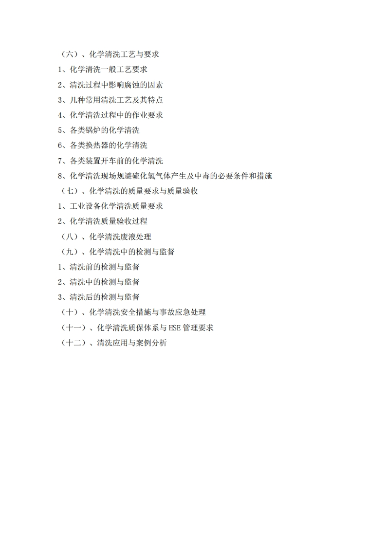 工业设备化学清洗培训课程(一)、化学清洗概述1、清洗的基本概念2、清洗的发展概况3、清洗的常用方法4、化学清洗的目的5、化学清洗的应用领域(二)、化学清洗设备与材质知识1、常见工业设备设备简介锅炉、换热器、反应釜、塔器、容器(储罐)及各类管道。2、化学清洗中常见材质及特性(三)、化学清洗前的准备工作1、清洗前对设备的了解内容2、垢及沉积物分析3、小型试验4、现场清洗条件的确认5、清洗方案的编制6、一般清洗工程程序(四)、化学清洗介质选择与应用1、清洗介质的一般要求2、常用清洗药剂及其特性3、清洗药剂的选择4、清洗介质的配制(五)、化学清洗系统的设计与安装1、清洗系统设计与安装的一般要求2、常用的清洗系统型式3、清洗系统中设备的选用
