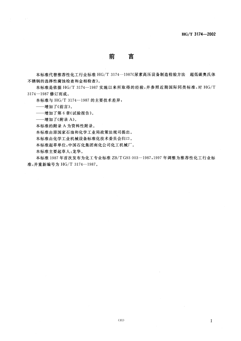 1CS71.120.10:75.180.20;23.020.30G93备案号:10954-2002HG中华人民共和国化工行业标准HG/T3174-2002代替HG/T3174-1987尿素高压设备制造检验方法尿素级超低碳铬镍钼奥氏体不锈钢的选择性腐蚀检查和金相检查Fabrication and inspection method forHigh pressure urea equipment selective corrosion andmetallographic examination on the urea grade extralow carbon Cr-Ni-Mo austenitic stainless steel2002-09-28发布2003-06-01实施中华人民共和国国家经济贸易委员会:发布