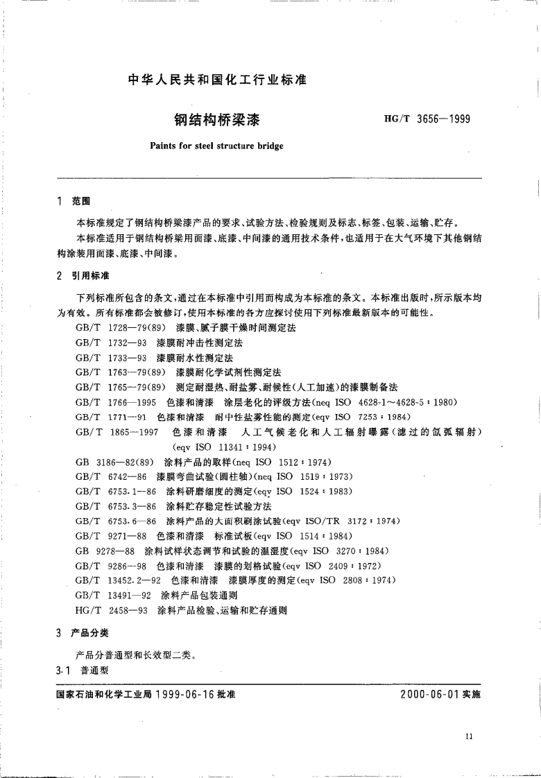 备案号:3878-1999HG/T3656一1999!.前言钢结构桥梁漆由于其特殊性能而广泛用于钢结构桥梁上,起着保护和装饰的作用,近年来在我国发展较快,但一直没有一个统一的标准。为稳定和提高此类产品的质量,满足不同用户的需求,特制定木标准。本标准是根据国内主要钢结构桥梁漆生产企业的产品质量要求,并参照国内外有关标准而制定的。由于钢结构桥梁漆包括的品种繁多,因此本标准制定为通用技术条件。本标准的附录A为提示的附录。本标准由中华人民共和国原化学工业部技术监督司提出。本标准由全国涂料和颜料标准化技术委员会归口。本标准主要起草单位:天津灯塔涂料股份有限公司、沈阳应用技术实验厂,中国船舶总公司725研究所。本标准参加起草单位:化工部常州涂料化工研究院、上海开林造漆厂、无锡霸润涂料化工有限公司、武汉双虎涂料股份有限公司、重庆三峡油漆股份有限公司、天津市东光特种涂料总厂、江苏省武进市凯星涂料厂、江苏省武进市美蓉防腐材料厂、湖南省金属材料总公司湖南金盛化工防腐研究中心、杭州油漆厂。本标准主要起草人:陆秀敏、翟惑棠、袁小波、王爱玲、方俊珍。
