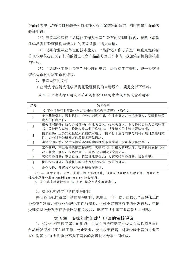 附件2:工业清洗行业清洗化学品委托验证机构管理规则第一章总则工业清洗行业清洗化学品委托验证机构(以下简称验证机构)在中国工业清洗协会“工业清洗行业品牌化工作办公室”(以下简称“品牌化工作办公室”)的统一管理下,开展工业清洗行业品牌产品认定工作中清洗化学品的委托验证工作。验证机构向“品牌化工作办公室”负责,并在检验活动中恪守职业道德、尊重科学、保证检验数据和结果的客观、公正。第二章验证机构应具备的条件1、应当依法设立,保证客观、公正和独立地从事检验、验证活动,并承担相应的法律责任。2、应当具有与其从事的化学品品类检验活动相适应的专业技术人员和管理人员。3、从事特殊产品的检验活动的验证机构,其专业技术人员和管理人员还应当符合相关法律、行政法规的规定要求。4、应当具备固定的工作场所,其工作环境应当保证检验数据和结果的真实、准确。5、应当具备进行正确的相应检验活动所需要、并满足相关检验检测标准或者技术规范要求的设备、设施。6、应当建立能够保证其公正性、独立性和与其承担的检验活动范围相适应的质量、计量管理体系,选择科学的市场产品抽样方式,制定相应的管理文件并有效实施。第三章验证机构的核准授予程序1、参与工业清洗行业品牌产品认定工作的清洗化学品委托验证机构,必须通过“品牌化工作办公室”审核,并经核准授予后方能开展委托验证工作。2、验证机构的核准与审核,采取限时间段提交设立申请、“验证机构审核专家组”集中审核评议,“品牌化工作办公室”核准和协会授权的工作程序。即“提交申请一专家组审核评议一品牌化工作办公室复核提报一协会授权委托”的核准授予程序。第四章申请的提交与受理1、申请的提交(1)工业清洗行业品牌产品清洗化学品委托验证机构的设立申请单位,应是行业内具备工业化实验验证能力和条件的协会会员单位。(2)验证机构的设立申请单位,应在“品牌化工作办公室”认可的清洗化