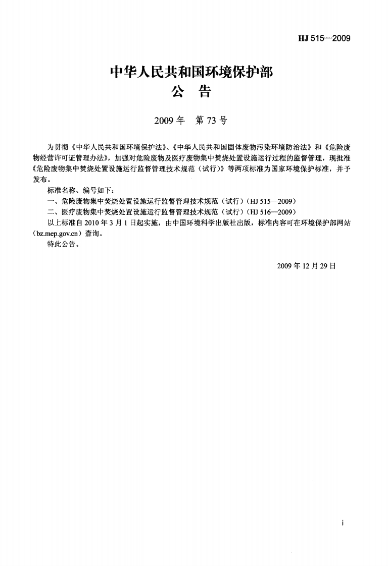 HJ中华人民共和国国家环境保护标准HJ515-2009危险废物集中焚烧处置设施运行监督管理技术规范(试行)Technical specifications for the supervision and management to the operationof centralized incineration disposal facilities for hazardous waste (On trial)2009-12-29发布2010-03-01实施环境保护部发布