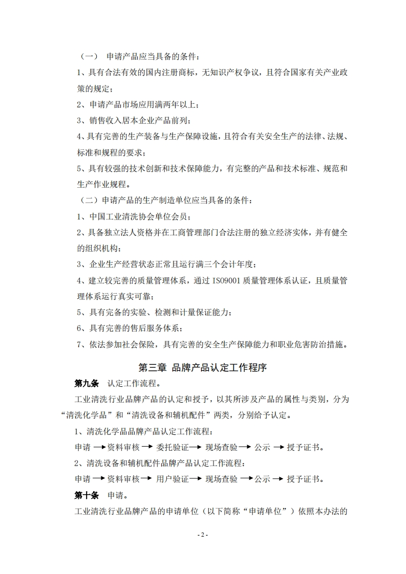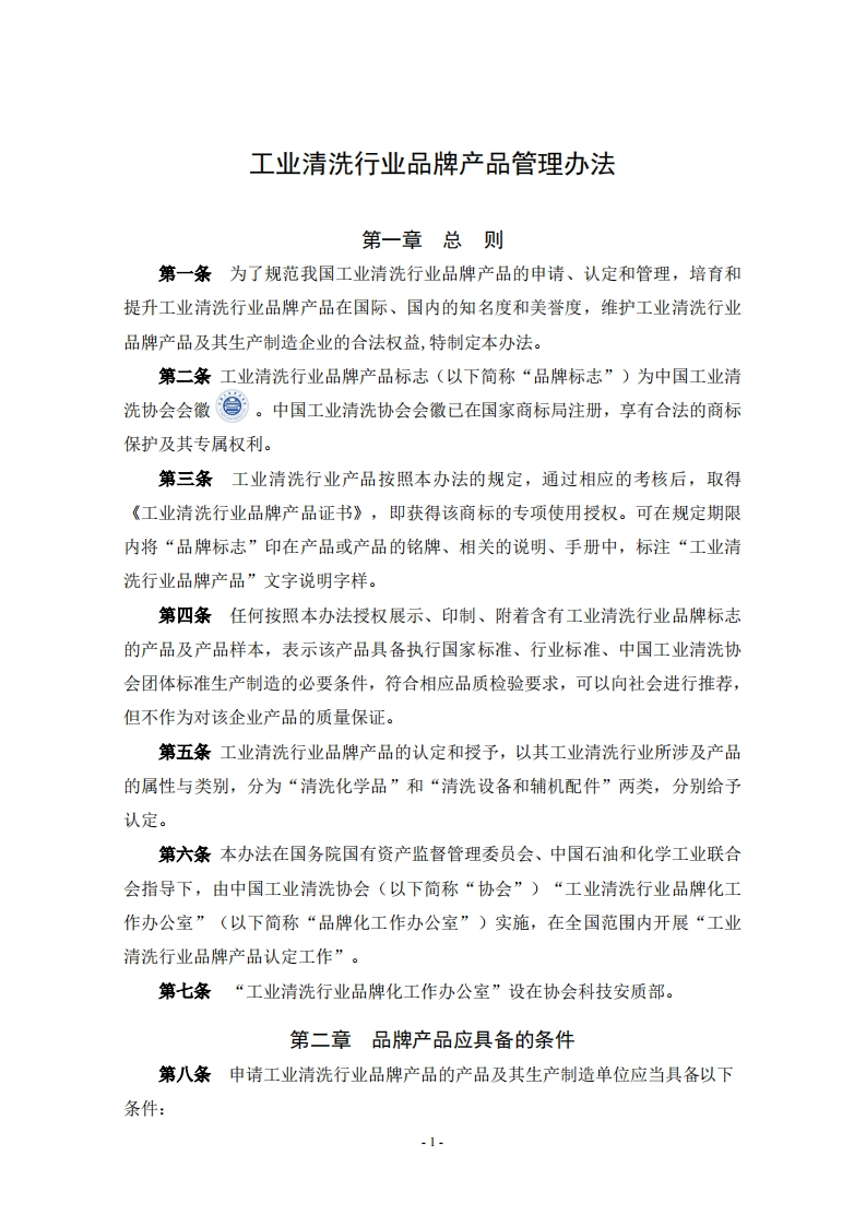 工业清洗行业品牌产品管理办法第一章总则第一条为了规范我国工业清洗行业品牌产品的申请、认定和管理,培育和提升工业清洗行业品牌产品在国际、国内的知名度和美誉度,维护工业清洗行业品牌产品及其生产制造企业的合法权益,特制定本办法。第二条工业清洗行业品牌产品标志(以下简称“品牌标志”)为中国工业清洗协会会徽管。中国工业清洗协会会徽已在国家商标局注册,享有合法的商标保护及其专属权利。第三条工业清洗行业产品按照本办法的规定,通过相应的考核后,取得《工业清洗行业品牌产品证书》,即获得该商标的专项使用授权。可在规定期限内将“品牌标志”印在产品或产品的铭牌、相关的说明、手册中,标注“工业清洗行业品牌产品”文字说明字样。第四条任何按照本办法授权展示、印制、附着含有工业清洗行业品牌标志的产品及产品样本,表示该产品具备执行国家标准、行业标准、中国工业清洗协会团体标准生产制造的必要条件,符合相应品质检验要求,可以向社会进行推荐,但不作为对该企业产品的质量保证。第五条工业清洗行业品牌产品的认定和授予,以其工业清洗行业所涉及产品的属性与类别,分为“清洗化学品”和“清洗设备和辅机配件”两类,分别给予认定。第六条本办法在国务院国有资产监督管理委员会、中国石油和化学工业联合会指导下,由中国工业清洗协会(以下简称“协会”)“工业清洗行业品牌化工作办公室”(以下简称“品牌化工作办公室”)实施,在全国范围内开展“工业清洗行业品牌产品认定工作”。第七条“工业清洗行业品牌化工作办公室”设在协会科技安质部。第二章品牌产品应具备的条件第八条申请工业清洗行业品牌产品的产品及其生产制造单位应当具备以下条件: