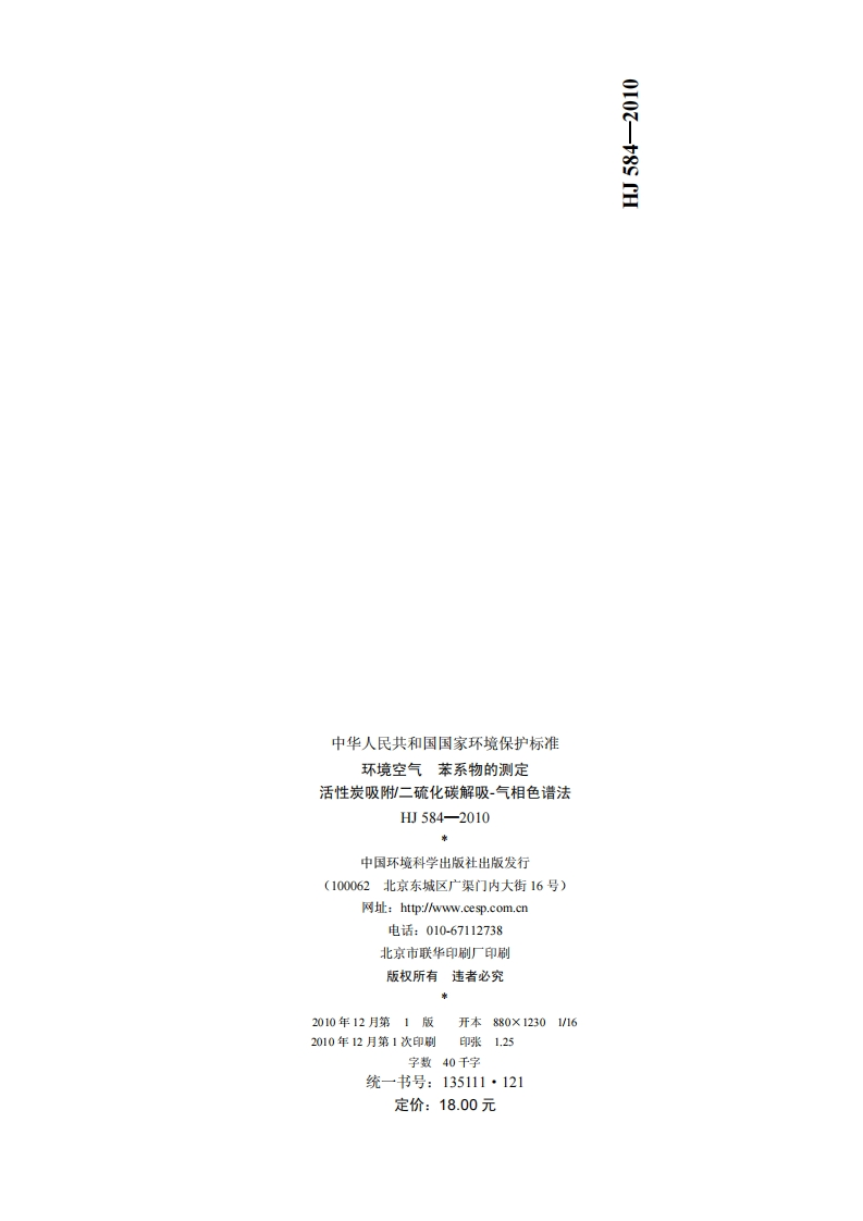 HJ中华人民共和国国家环境保护标准HJ584-2010代替GB/T14670一93环境空气苯系物的测定活性炭吸附/二硫化碳解吸气相色谱法Ambient air-Determination of benzene and its analogies by activatedcharcoal adsorption carbon disulfide desorption and gas chromatography2010-09-20发布2010-12-01实施环境保护部发布