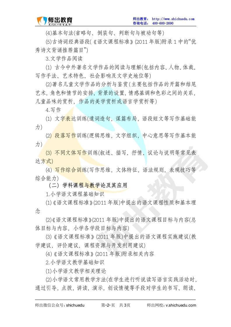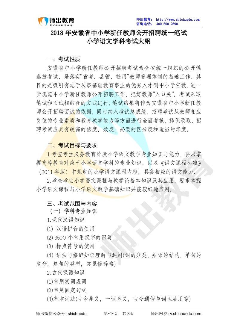(门师出教育师出教育:http://w.shichuedu.com咨询电话:400-600-26902018年安徽省中小学新任教师公开招聘统一笔试小学语文学科考试大纲一、考试性质安徽省中小学新任教师公开招聘考试为全省统一组织的公开性选拔考试,是落实“省考、县管、校用”教师管理体制的基础工作。其目的是吸引有志于从事基础教育事业的优秀人才到中小学任教,进步规范中小学新任教师公开招聘工作,把好教师“入口关”。考试采取笔试和面试相结合的方式进行。笔试结果将作为安徽省中小学新任教师公开招聘面试的依据,同时纳入考试总成绩。招聘考试从教师相应岗位的专业素质和教育教学能力等方面进行全面考核,择优录取。招聘考试应具有较高的信度、效度,必要的区分度和适当的难度。二、考试目标与要求1.考查考生义务教育阶段小学语文教学专业知识与能力,要求掌握高等教育对应于小学语文学科的专业知识,以及《语文课程标准》(2011年版)中规定的小学语文课程内容,具备相应的语文能力。2.考查考生小学语文课程与教学论基本知识及其应用,要求掌握小学语文课程与小学语文教学基础知识并能较好地应用。三、考试范围与内容(一)学科专业知识1.现代汉语知识(1)汉语拼音的使用(2)3500个常用汉字的识写(3)标点符号的使用(4)语法与修辞知识理解与运用(词的分类,短语的结构,单句的成分,复句的类型,常见修辞格)2.古代汉语知识(1)常用实词虚词(2)常见固定句式(3)基本词法(古今异义,一词多义,古今通假与词性活用等)师出微信公众号:shichuedu第-1-页共3页师出网校:v.shichuedu.com