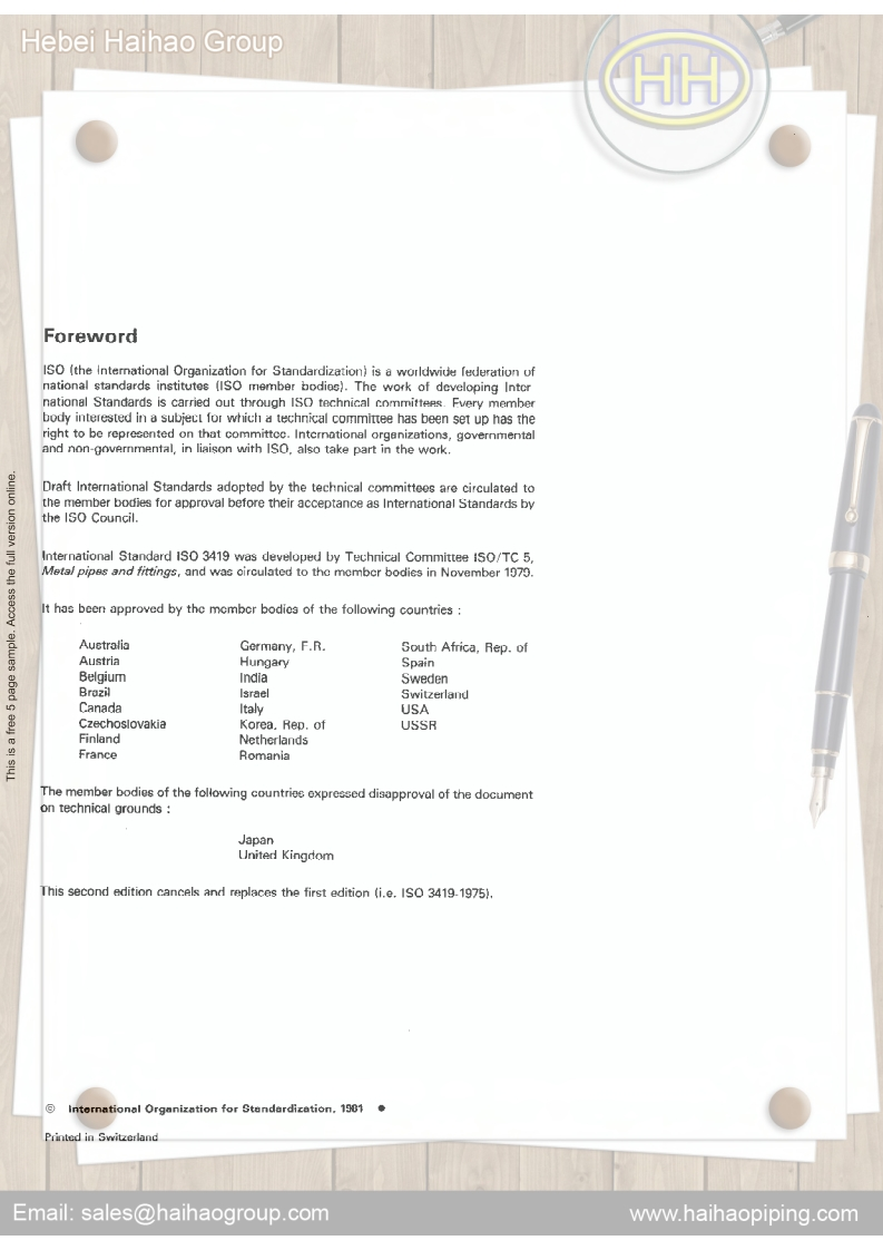 Hebei Haihao GroupInternational Standard1s03419Non-alloy and alloy steel butt-welding fittingsAccessoires a souder bout a bout en acier non alli et allieSecond edition -1981-07-15Corrected and reprinted-1991-05-15UDC621.643.411.4Ref.No.1S03419-1981(E)Deecriptors piping,steel tubes.pipe fittings,unaloyed steale,alloy steele,pipe bends,welded tubes,designation,symbols,dimensions.dimensional tolerances,marking.pipe caps.Price based on 17 pagesEmail:sales@haihaogroup.comwww.haihaopiping.com