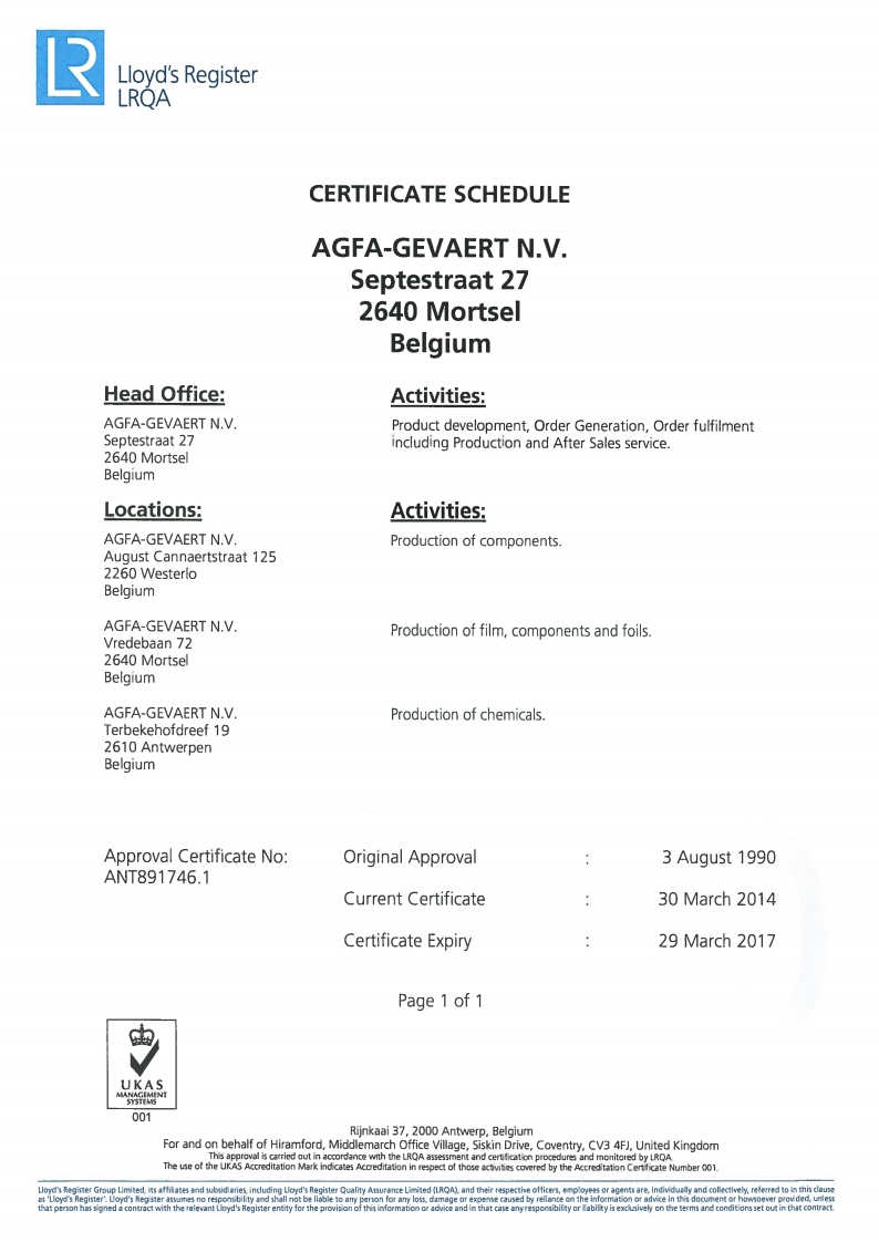 RLloyd's RegisterLRQACERTIFICATE OF APPROVALThis is to certify that the Quality Management System of:AGFA-GEVAERT N.V.Septestraat 272640 MortselBelgiumhas been approved by Lloyd's Register Quality Assuranceto the following Quality Management System Standard:I509001:2008The Quality Management System is applicable to:Product development,Order generation,Order fulfilmentincluding Production and After Sales servicefor products supplied to the medical imaging,non-destructive testing,graphic printing,aerialphotography,photo tooling,identification and security,electronics industry and functional foils.This certificate is valid only in association with the certificate schedule bearing the same numberon which the locations applicable to this approval are listed.Approval Certificate No:Original Approval3 August 1990ANT891746.1Current Certificate30 March 2014Certificate Expiry29 March 2017Issued by:Lloyd's Register EMEA,Antwerp Office for andon behalf of Lloyd's Register Quality Assurance Limited001Rijnkaai 37,2000 Antwerp,BelgiumFor and on behalf of Hiramford,Middlemarch Office village,Siskin Drive,Coventry.CV3 4FJ.United KingdomoGroup Limited,itsfaendsubsid including Loyd's Register QualityAssuraneLimited (RAand their respeffiroyagentsarenddyandyreferredto this dause
