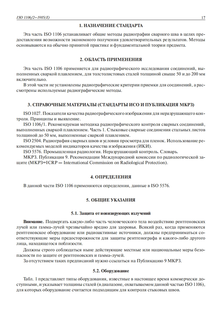 16M E K Iy H A P O I H bIC TAHIA PTINTERNATIONAL ORGANIZATION FOR STANDARTIZATIONORGANIZATION INTERNATIONALE DE NORMALISATIONMEXKIYHAPOIHAR OPTAHN3ALINA IIO CTAHIAPTN3ALINMPEKOMEHYEMA METOKAPALNOTPAONYECKOTO KOHTPO CBAPHbIXCOELNHEHNN,BbInoHEHHbIX CBAPKONI几ABEHNEM1S0YACTb 2.CTbIKOBbIE CBAPHbIE COEANHEHNS CTAbHbIXMCTOB TONLINHON CBbILIE 50N O200 MM BKNIOYNTENbHO.1106/2-BbInOHEHHbIE CBAPKON ABNEHNEM1985(E)RECOMMENDED PRACTICE FOR RADIOGRAPHIC EXAMINATION OFFUSION WELDED JOINTSPART 2.FUSIONWELDED BUTT JOINTS IN STEEL PLATES THICKER THAN 50 MM ANDUP TO AND INCLUDING 200 MM IN THICKNESSBBEEHMEPannorpaonyecKne MeTonbI IA KOHTPONA CTEIKOBbIX CBapHbIx coeHeHni CTabHbIX JHCTOBTOMIIINHON MeHbIe wIH paBHoi 50 MM,BbIOJHeHHbIX CBapkoi naBneHneM,onncaHbI B ISO 1106/1.YTOObI OXBaTHTb CBapHble coeHeHHa CTaIbHbIX JIHCTOB TOJIIIHHO CBbIILe 50 O 200 MM BKIIOYH-TeJbHo,naHHas yacTb ISO 1106 06ycnoBnBaeTca CXOxHMH HanpaBeHHAMH.3ra yacTb ISO 1106 B pe3ybTaTe o6ecneynT 6onee yHnonunpoBaHHyo MeTonnky nynpocTHT pac-opoBKy peHtre HOBCKHX CHMMKOB.OHa He ycTaHaBJInBaeT HopM npHeMKn IUIS CBapHbIX IIBOB.HMeeTca orpaHnueHHoe yHcno THnOB o6opynoBaHna,npnronHoro a naHHon pa6oTbI (Hanpn-Mep,oTcyTCTByIOT IHpoko npHmeHaeMble ycTaHoBKH,paboralome B IHana3oHe OT 400 o 1000 KB).MMeromeeca B pacnopskeHnn o6opynoBaHne o6benHeHo B HeKoTopoe KoJnyecTBo rpynn H no-pooHo onHcaHbI MeTOIbI,KOTopbIe CooTBeTCTByIOT H3rOTOBJIeHHIO ynoBJeTBoPHTeJbHbIX pannorpa-HyecKHX CHHMKOB Ha ooopynoBaHnn B Kaxknoi rpynne.MHorHe IyHKTbI B pekoMeHnyemoH MeTo-HKe ABJIAIOTCA OOIINMH IIA Bcex MeTOnOB.B Taon.I npHBeneHbI TOMIMHbI CTamH,IIa KoTopon Kaxnbln THn ooopynoBaHna cunTaeTca noI-XOIIIIHM;JUI 66JIbIIIHX TOJIIIINH HMeeTCa BO3MOXKHOCTE HCNOJb30BaHHa 6eTaTpOHOB HJHHeMHbIXyckopnTeJen.HapncyHke yka3aHa OTHoCHTeJbHaa paboyaa xapaktepnctnka pa3HbIx THnoB ooopyoBaHnsB TepMHHax uyBCTBHTeJIbHOCTH HKM Ha OCHOBe onHcaHHbIX MeTONOB.OTH BeJH4HHbI yyBCTBHTeJb-HOCTH He aBJIoTca 0693aTeJbHbIMM,a nalorca B KayecTBe pykoBonaero npHHunna no BbloopyMeTona Ia HHIINBHIYabHON TOJIIIINHbI CBapHoro IIBa.IIpH HeoOXONMOCTH B npHMeyaHHaX npHBOIATCA nOACHeHHA.