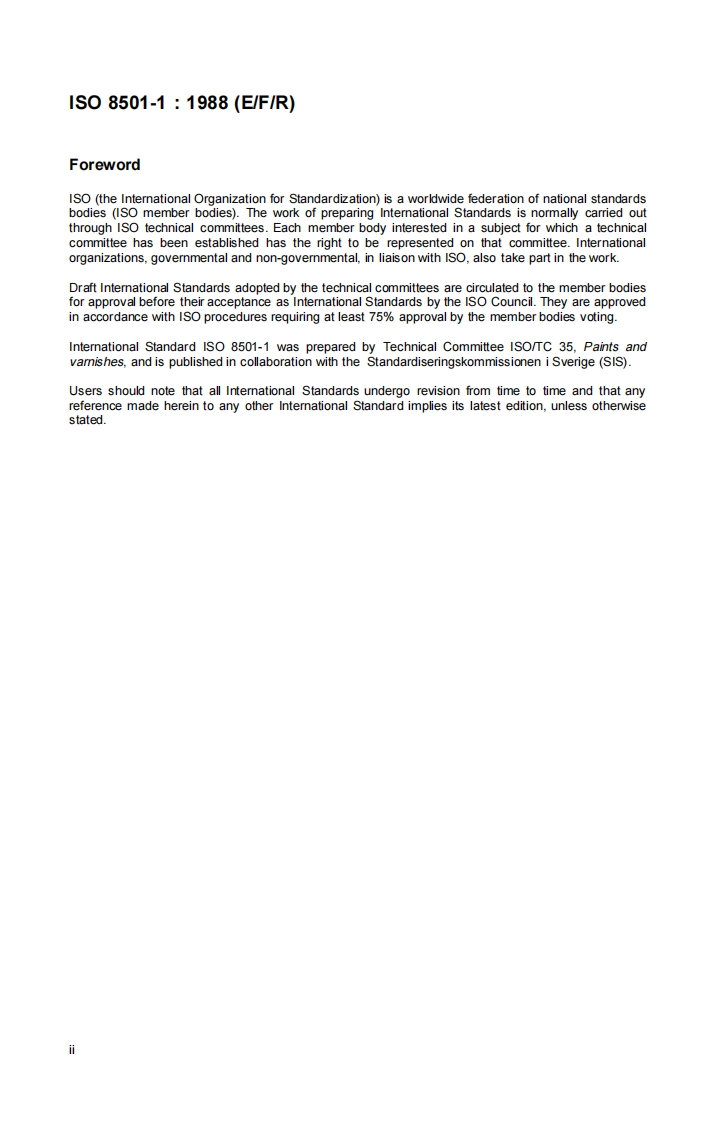 ISOINTERNATIONAL STANDARD8501-1First edition1988-12-15INTERNATIONAL ORGANIZATION FOR STANDARDIZATIONPreparation of steel sustrates before application of paints and relatedproducts-Visual assessment of surface cleanliness-Part 1:Rust grades and preparation grades of uncoated steel substrates and of steelsubstrates after overall removal of previous coatingsEndorsement14Juy1989INTERNATIONAL STANDARDIs08501-1:1988is endorsed asAUSTRALIAN STANDARD1627.9-1989Metal finishing-Preparation and pretreatment of surfacesPart 9:Pictorial surface preparation standards for painting steel surfaceswithout Australian AmendmentThis endorsement was recommended by Committee MT/9,MetalFinishing.and was approved on behalf of the Council of StandardsAustralia on 16 May 1989This endorsement differs from the 1974 edition by the inclusionof four additional photographs of flame-cleaned surfaces fromDIN 55 928,Part 4,Supplement 1.STANDARDS AUSTRALIA1 The Crescent,Homebush,NSW 2140Reference numberIS08501-1:1988(E/F/R)