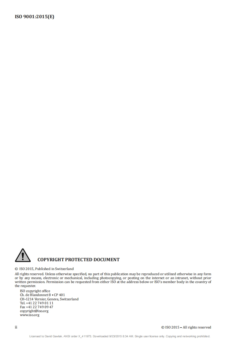 INTERNATIONALISOSTANDARD9001Fifth edition2015-09-15Quality management systems-RequirementsSystemes de management de la qualite-ExigencesReference number豆在IS09001:2015(E©IS02015Licensed to David Gawlak.ANSI order X_411973.Downloaded 9/232015:34 AM.Single user license only.Copying and networking prohibited.