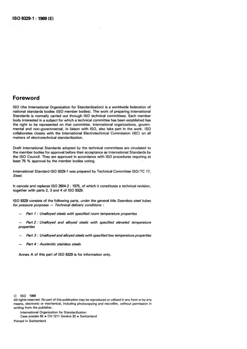INTERNATIONALISOSTANDARD9329-1First edition198907-15Seamless steel tubes for pressure purposesTechnical delivery conditionsPart 1Unalloyed steels with specified room temperaturepropertiesTubes sans soudure en acier pour service sous pression-Conditions techniquesde livraisonPartie 1:Aciers non allies avec caracteristiques specifiees a temperature ambianteReference number1S09329-1:1989(E)