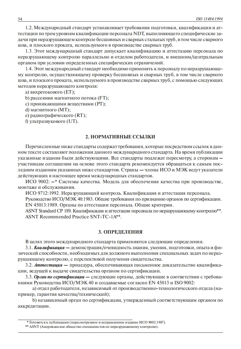 53M E K Iy H A P O I H bIC TAH IA PINTERNATIONAL ORGANIZATION FOR STANDARTIZATIONORGANIZATION INTERNATIONALE DE NORMALISATIONMEXKIYHAPOIHA OPTAHN3ALINA IIO CTAHIAPTN3ALINMTPy5bl CTAbHbIE HANOPHbIE.KBANONKALN N ATTECTALN9 NEPCOHAJAB OBACTN HEPA3PYLLAIOLLLETO KOHTPOISOSTEEL TUBES FOR PRESSURE PURPOSES.11484-1994QUALIFICATION AND CERTIFICATION OF NON-DESTRUCTIVE TESTINGPERSONNELBBEJEHMEJaHHbI MexryHaponHbln cTaHnapT Kacaerca KBannonkaun H aTTectaunn nepcoHana,3aHa-TorO B npoBeneHHH Hepa3pymalomero KoHTpona(NDT)CTaJbHbIX HanopHbIX Tpy6,BKouaa noc-KiΠDoKaT,HcnOJb3 yeMbIH BΠpoH3 BONCTBe cBapH五IX TPY6.TIpH3HaHo,YTO B MacuTabe MHpoBon HHnycTpHn cTaJbHbIX Tpy6 npeoonanaeT noyaBTomaTn-yeckoe/aBToMaTHqeckoe o6opynoBaHne a Hepa3pymalomero KoHTpoJ,KoTopoe ncnoJb3yeTcacnemnaJncTaMn NDT Ia ycTaHoBneHna LeJoCTHOCTH nponyKIn B npoTHBoBec raBHbIM 06pa3OMpyuHbIM MeronaM,HalenM npnMeHeHne B npyrnx ceKTopax npoMbmeHHOCTH.B pe3ynbrare9TOT MexKnyHapoHbIA cTaHnapT nonycKaeT napaeJbHylo KBanoHKalnIo H aTTecTalnIo H OTHeJoMpaooTonaTeJa,H BHeIHnM/ueHTpabHbIM opraHoM npn ycnoBnn onpeneneHHbIx orpaHnyeHni.TIpn nonroToBke Toro MexnyHaponHoro cTaHnapTa 6bIH yuTeHbI wIH onoopeHbI B yacTH,eroKacalomeica,Tpe6oBaHna MCO 9712.OIHako cnenyeT 3ameTHTb,YTo nepBH4Haa pa6oTa n cne-uHoHyeckni xapakTep 3aay NDT,pemaembix nepcoHanoM NDT npn npoBepke cTabHbIX Tpy6 HnJocKoro npokaTa,HcnoJb3yemoro B npon3BOICTBe cBapHbIX Tpy6,HecoMHeHHO BbIXOIAT 3a pam-KH o6nacTn pacnpocTpaHeHna NCO 9712 (CM.n.3.20 NCO 9712:1992).TaKHM o6pa30M,B KOHTekcTe Toro MexnyHapo Horo cTaHnapra Tpe6oBaHHa HCO 9712Hecne-OBaJo 6bI npHHHMaTb 3a OCHOBy WIH JONOJHHTeJbHbIN MHHHMyM Tpe6oBaHHH,HO 3TO He HCKJIO-yaeT npaB moooro yenoBe ka nonaBaTb 3aaBneHne H nonyuaTb KBannonkaunio/aTTecTalno B CooT-BeTCTBHH C HCO 9712,ecn Tak npHHaTo B IpyroM ceKTope.CuHTaeTCA,YTO 9TOT MexnyHapoHbm cTaHnapT MoxeT6bITE npHMeHeH Is 6e3HanopHbIx cTab-HbIX Tpy6 H B Ipyrnx coepax cneunonyeckoro npon3BOncTBa.1.OBJIACTb PACIIPOCTPAHEHNA1.1.JIaHHbI MexnyHapomHbm cTaHnapT xapakrepn3yeT KBannonkauio n aTrecTaumio nepco-Hana,3aHaToro B Hepa3pymalomeM KoHTpone (NDT)6ecIoBHbIX H cBapHbIX Tpy6,BKJoyaa noc-KHH npokat,HcnoJb3yeMbI B npon3BOICTBe CTaIbHbIX HanopHbIX Tpyo.