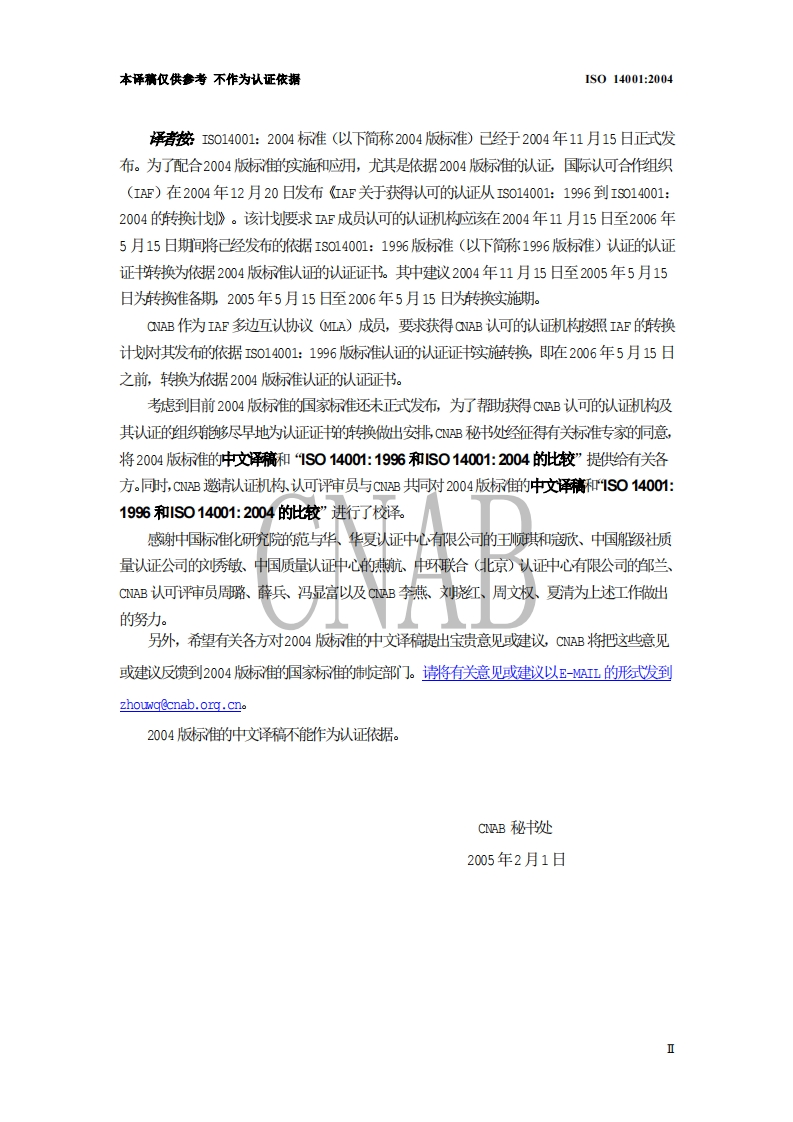 ISO14001:2004标准CNAB版348072@abc4个月前发布关注私信0.47MB29页032ISO14001:2004标准CNAB版此内容为付费资源,请付费后查看¥16¥23黄金会员免费钻石会员免费立即购买您当前未登录!建议登陆后购买,可保存购买订单付费资源 第1页 / 共29页 第2页 / 共29页 试读已结束,还剩27页,您可下载完整版后进行离线阅读 THE END标准规范 文本预览 本译稿仅供参考不作为认证依据IS014001:2004IS014001:2004(中文译稿)CNAB中国国家认证机构认可委员会2005年2月1日I 查看更多 收起部分 喜欢就支持一下吧收藏