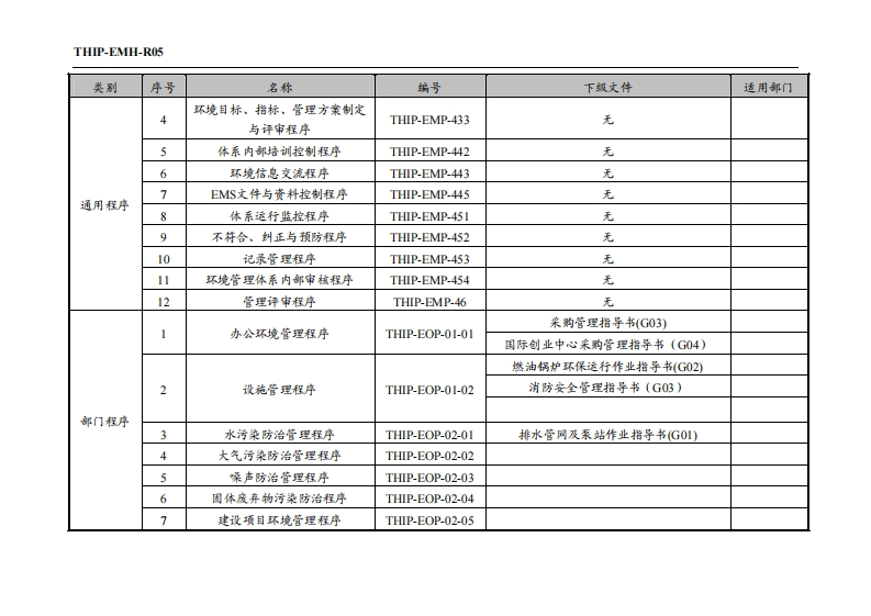 THIP-EMH-R05附件7环境管理体系文件清单类别序号名称编号下级文件适用部门手册1环境管理手册THIP-EMH通用程序和部门程序天津新技术产业园区华苑产业区背景情况无概况2园区地理区位平面图无3环境管理体系组织机构图无部门环境管理职责描述无5环境管理者代表任命书无6IS014001体系运行发布令无手册附件1环境方针THIP-EMH-ROI无2环境因素清单THIP-EMP-431-R02无3重要环境因素清单THIP-EMP-431-R04无4适用环境法律法规及要求清单THIP-EMP-432-R02无5环境目标、指标、管理方案THIP-EMH-R02无6环境管理体系职责分配表THIP-EMH-R04无7环境管理体系文件清单THIP-EMH-R05无8环境管理体系记录清单THIP-EMP-453-ROI无通用程序1环境方针传达实施程序THIP-EMP-42无2环境因素识别与评价程序THIP-EMP-431无3环境法规搜集与应用程序THIP-EMP-432无