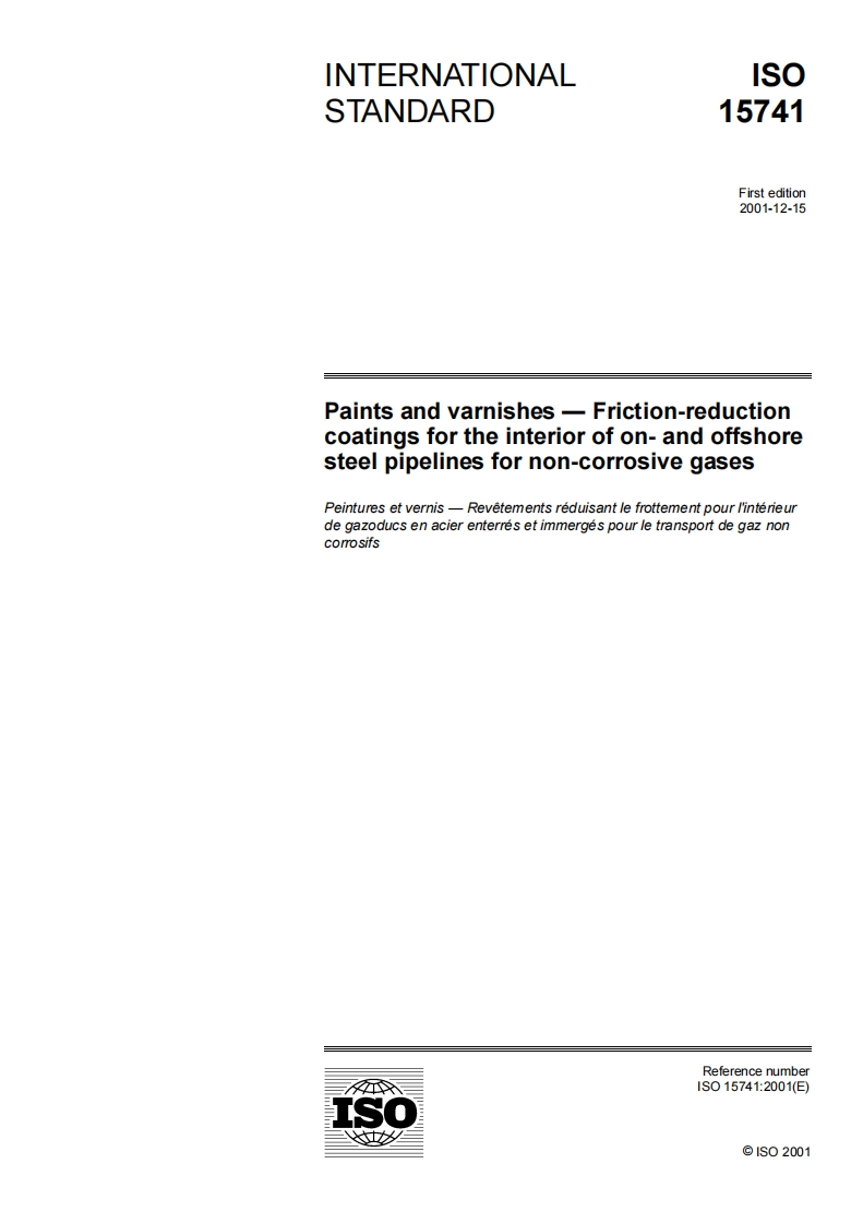INTERNATIONALISOSTANDARD15741First edition2001-12-15Paints and varnishes -Friction-reductioncoatings for the interior of on-and offshoresteel pipelines for non-corrosive gasesPeintures et vernis-Revetements reduisant le frottement pour l'interieurde gazoducs en acier enterres et immerges pour le transport de gaz noncomosifsReference number1S015741:2001(E)ISO©1S02001