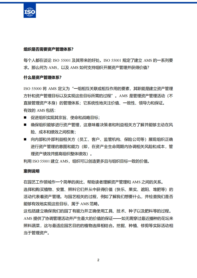 ISO/TC 251-Asset Management-ISO 55001理解符合IS055001标准的资产管理体系关于IS0/TC251IS0/T℃251资产管理技术委员会,负责制定IS055000系列标准。标准界定了资产管理领域的良好实践和管理体系要求。可以在committee.iso.orgc251www.55000.org.cn网站了解更多信息ISO/TC251第4工作组感谢Hjalmar Boon、.Tom Smith和David McKeown对本文档写作和校对的贡献。Jack Dempsey ISO/TC251WG4召集人jdempsey@definitivelogic.com资产管理:一种全面且系统的方法自人类发明第一件工具以来,人们就开始关注资产。随着时间的推移,各类组织制定了相应的规则和专业机制来创建、使用和维护有形和无形资产。这在《在资产管理的前提下处置资产》一文中定义为管理资产。在过去20年中,资产管理(“组织实现资产价值的综合性活动”)作为整合各类活动的整体方法出现。资产管理的目的在于了解和管理相关风险的同时,在资产的整个生命周期内,通过资产合理利用为组织创造总的最大化价值。资产管理将组织目标和实现目标依赖的资产关联起来。资产管理体系(AMS)通过系统地协调这些关系,并在个人和组织内贯彻,以持续改进资产管理。AMS提供了一种系统的方法来有效地实施资产管理,并通过资产获得实现组织目标所需的价值。AMS通过在组织环境中观察绩效和(潜在)变化以协调组织的战略和计划,最终实现组织获益。http://www.55000.org.cn/