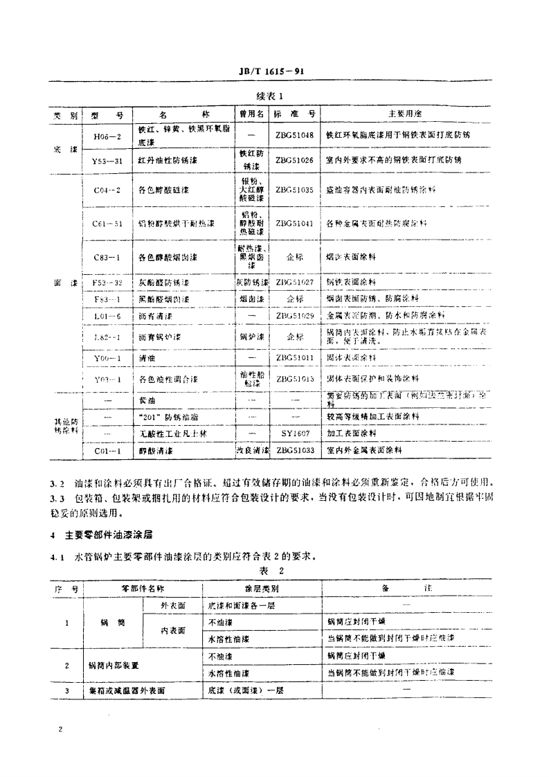 中华人民共和国机械行业标准JB/T1615-91代警JB1615-83锅炉油漆和包装技术条件1主题内容与适用范围本标准规定了锅炉油榛和包装技术要求。本标准适用于固定式锅炉,对配套的辅机和附件也可参照采用。2引用标准GB146.1标准轨距铁路机车车辆限界GB191包装储运指示标志ZBG51005锌黄酚醛防锈漆ZBG51006红丹醇酸防锈棒ZBG51010铁红醇酸底漆ZBG51011清油ZBG51013各色油性调合漆ZBG51024锌黄、铁红、灰酚醛底漆ZBG51026红丹油性防锈漆ZBG51027灰酚醛防锈漆ZBG51029沥背清漆ZBG51033斛酸清漆ZBG51035各色醇酸磁漆ZBG51041铝粉醇酸烘千耐热漆ZBG51048铁红、锌黄、铁黑环氧胎底凑SY1607工业凡士林3材料3.1常用油漆和防锈涂料按表】选用,也可选用类别相同的其他型号油漆或防锈涂料。表1类别型号名称曾用名标准号主要用途C06-1铁红碎酸底漆ZBG51010钢铁表面打底防锈C53-1红丹醇酸防锈漆ZBG51006大型钢结构表面打底防锈钼铬红环氧贴脂底漆底读硼钡漆F06-1锌黄、铁红、灰酚醛底读一ZBG51024铁红、灰酚醛底谏用于钢铁表面打底防锈F53一34锌黄酚醛防锈读碎黄防锈谍ZBG51005轻金属表面打底防锈F53-8铝粉、铁红、酚醛防锈读企标钢结构表面打底防锈机械电子工业部1992-06一16批准1992-12一01实施
