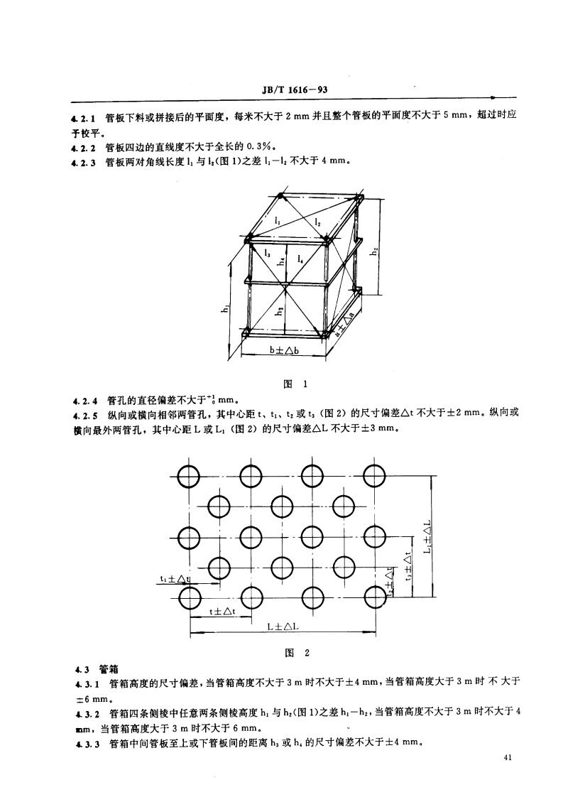 中华人民共和国机械行业标准JB/T1616-93代替JB1616-83管式空气预热器技术条件1主题内容与适用范围本标准规定了管式空气预热器的制造和验收要求。本标准适用于热风温度不大于400℃的管式空气预热器。2引用标准GB3274普通碳素结构钢和低合金结构钢热轧厚钢板技术条件YB242直径5~152毫米电焊钢管JB/T1615锅炉油漆和包装技术条件3技术要求3.1材料3.1.1管式空气预热器材料的选用应按3.1.2和3.1.3条的规定。制造管式空气预热器的材料应符合设计图样和相应材料标准的要求,材料代用应按规定翻序审批。3.1.2受热面管子应符合YB242的要求。3.1.3钢板应符合GB3274的要求。3.2拼接3.2,1受热面管子应尽量用整根管子制成,长度不够时允许拼接,但拼接用管子的最短长度不小于300mm.3.2.2管板应尽量用整块钢板制成,尺寸不够时允许拼接,但拼接数量不宜超过3块,拼接用钢板的最小宽度不小于300mm。3.3表面质量3.3.1管子拼接时,对接焊缝的表面不得有气孔、裂纹和烧穿等缺陷。3.3.2管板拼接时,对接焊缝的表面不得有密集气孔和裂纹等缺陷。焊缝的咬边深度不大于1mm,两侧咬边总长度不大于该焊缝长度的25%。3.3.3管板拼接后,应将焊缝的余高修平。在修磨过程中造成的凹陷深度不得大于板厚的15%并且最大不超过2mm。超过2mm时应补焊并修磨。3.3.4受热面管子与管板连接时,管端伸出管板的长度应在0~2mm的范围内,角焊缝的表面不应有气孔和裂纹等缺陷。4制造和装配公差4.1对接焊缝边缘偏差4.1.1管子拼接时,对接焊缝的边缘偏差不大于0.5mm。4.1,2管板拼接时,对接焊缝的边缘偏差当板厚不大于18mm时,不大于1.5mm,当板厚大于18mm时不大于2mm。4.2管板机械工业部1993一06一01批准1994一01一01实施40