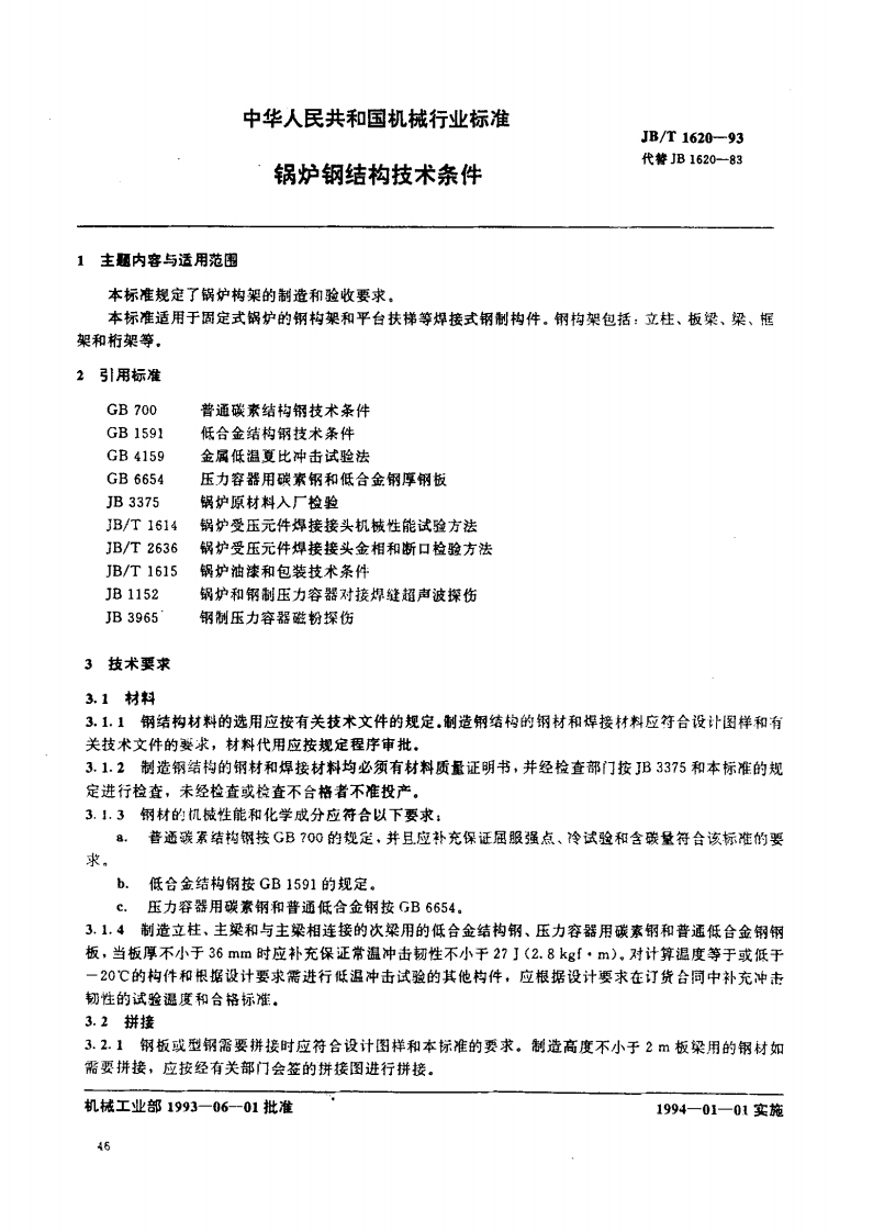 中华人民共和国机械行业标准JB/T1620-93代誓JB1620一83锅炉钢结构技术条件1主题内容与适用范围本标准规定了锅炉构架的制造和验收要求。本标准适用于固定式锅炉的钢构架和平台扶梯等焊接式钢制构件。钢构架包括:立柱、板梁、梁、框架和桁架等。2引用标准GB700普通碳素结构钢技术条件GB1591低合金结构钢技术条件GB4159金属低温夏比冲击试验法GB6654压力容器用碳素郁和低合金钢厚钢板JB3375锅炉原材料入厂检验JB/T1614锅炉受压元件焊接接头机械性能试验方法JB/T2636锅炉受压元件焊接接头金相和断口检验方法JB/T1615锅炉油漆和包装技术条件JB1152钢炉和钢制压力容器对接焊缝超声波探伤JB3965钢制压力容器磁粉探伤3技术要求3.1材料3.1.1钢结构材料的选用应按有关技术文件的规定.制造钢结构的钢材和焊接材料应符合设计图样和有关技术文件的要求,材料代用应按规定程序审批。3.1.2制造钢结构的钢材和焊接材料均必须有材料质量证明书,并经检查部门按JB3375和本标准的规定进行检查,未经检查或检查不合格者不准投产。3.1.3钢材的机械性能和化学成分应符合以下要求:8,普通碳系结构钢按GB?00的趣定,并且应补充保证屈服强点、冷怜试验和含碳量符合该标准的要求。b.低合金结构钢按GB1591的规定。c.压力容器用碳素钢和普通低合金钢按GB6654.3.1,4制造立柱、主梁和与主梁相连接的次梁用的低合金结构钢、压力容器用碳素钢和普通低合金钢钢板,当板厚不小于36mm时应补充保证常温冲击韧性不小干27】(2.8kg「·m),对计算温度等于或低于一20℃的构件和根据设计要求需进行低温冲击试验的其他构件,应根据设计要求在订货合同中补充冲击韧性的试验温度和合格标准。3.2拼接3.2.1钢板或型钢需要拼接时应符合设计图样和本标准的要求。制造高度不小于2m板梁用的钢材如需要拼接,应按经有关部门会签的拼接图进行拼接。机械工业部1993一06-一01批准1994一01一01实施6