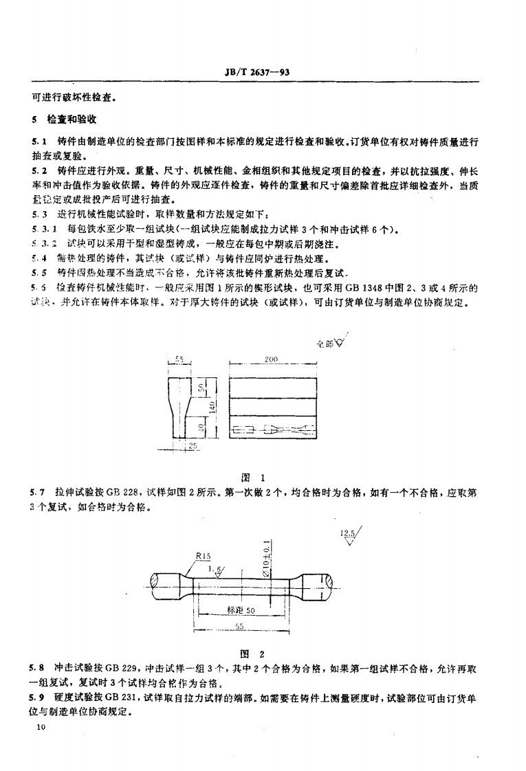 中华人民共和国机械行业标准JB/T2637-93代誓jB2637一81锅炉承压球墨铸铁件技术条件1主题内容与适用范围本标准规定了锅炉承压球墨铸铁件的制造和验收要求。本标准适用于固定式热水锅炉和额定蒸汽压力不大于2.4MPa、额定蒸汽温度不大于300℃的固定式蒸汽锅炉中公称通径小于100mm的球墨铸铁承压铸件(下简称铸件).2引用标准GB228金属拉伸试验法·GB229金属材料夏比(U型缺口)冲击试验方法GB231金属布氏硬度试验方法GB1348球墨铸铁件JB1612锅炉水压试验技术条件JB1802稀土镁球墨铸铁金相标准JB2854铸铁件机械加工余量、尺寸公差和重量偏差。3材料铸件应采用GB1348中牌号为QT40一17的球墨铸铁制造.4技术要求4.1俦件的熔炼和热处理应符合有关工艺规程的要求。4.2铸件的机械性能可在铸造后或热处理后进行检查,4.3如需检查化学成分,应在图样上注明,对铸件有特殊要求时,由订货单位与制造单位协商后确定。4.4球墨,铁的金相组织按JB1802进行评定,合格标准如下:a.球化级别以1~3级为合格。b.热处理后铁素体量应大于85%,磷共晶小于2%,渗碳体小于1%。4.5铸件的机械加工余量、尺寸偏差和重量偏差应符合图样和工艺文件的要求。当图样或工艺文件未作规定时应按JB2854的规定,铸件的精度等级应根据铸件尺寸按表1选用。表1mm未注明的铸件尺寸L≤2502506300L精度等级10114.6铸件上的型砂、芯砂和芯骨应清除干净、浇口、官口、多内、结疤、飞边、氧化皮和粘砂等均应清除。4.7热处理后允许存在直径小于3mm、深度不超过壁厚20%的皮下气孔,4.8铸件的密封面上不应有影响密封性的缺陷存在。4.9等件上承受压力的部位不准补焊。4.10馋件不应有密集性缩孔、裂纹、影响强度的砂眼、非金属夹杂物和疏松等严重铸造缺陷,必要时机械工业部1993一06一01批准1994一01—01实施
