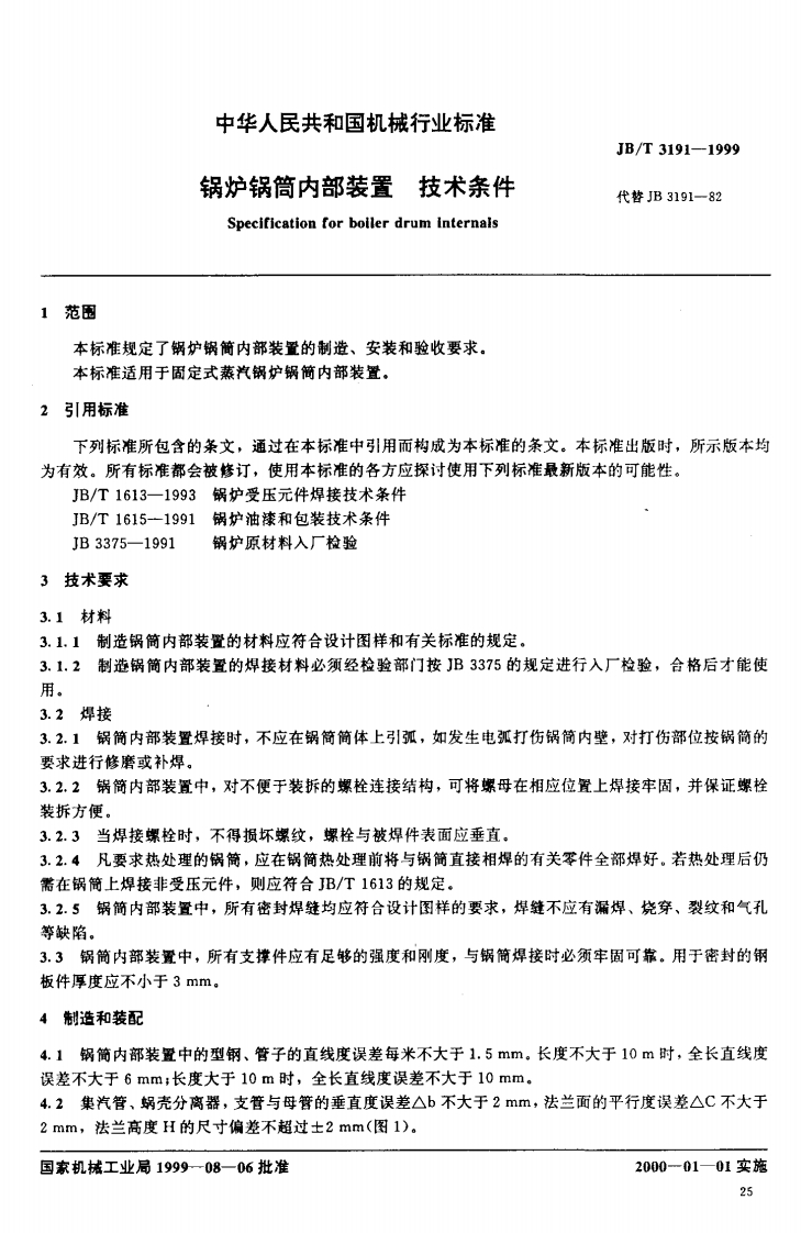 JB/T3191--1999前言本标准是对JB3191一82《锅简内部装置技术条件》的修订。本标准与JB3191一82的主要技术差异如下:1增加了引用标准的导语:2消除了原标准与96年《蒸汽锅炉安全技术监察规程》第78条不一致的地方:3原标准条文需要明确的地方予以明确、完善:4适当调整尺寸公差要求:5根据锅简内部装置形式的需要,增加新内容。本标准自实施之日起,代替JB3191一82.本标准由全国锅炉标准化技术委员会提出并归口。本标准起草单位:北京巴布科克·威尔科克斯有限公司。本标准主要起草人:郭毅、贺世华。24