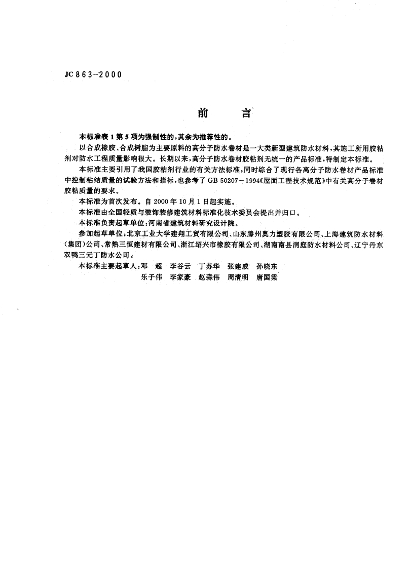 JC863-2000高分子防水卷材胶粘剂348072@abc4个月前发布关注私信0.36MB8页043JC863-2000高分子防水卷材胶粘剂此内容为付费资源,请付费后查看¥16¥23黄金会员免费钻石会员免费立即购买您当前未登录!建议登陆后购买,可保存购买订单付费资源 第1页 / 共8页 第2页 / 共8页 试读已结束,还剩6页,您可下载完整版后进行离线阅读 THE END标准规范 文本预览 G中华人民共和国建材行业标准JC863-2000高分子防水卷材胶粘剂Adhesives for polymer waterproof sheets2000-06-26发布2000-10-01实施国家建筑材料工业局发布 查看更多 收起部分 喜欢就支持一下吧收藏