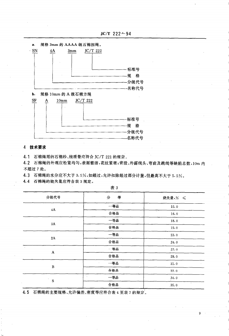 中华人民共和国建材行业标准JC/T222-94石棉绳代替J222-791主题内容与适用范围本标准规定了石棉绳的产品分类与分级、技术要求、试验方法、检验规则等。本标准适用于以干法纺成的石棉纱、线制作的石棉绳。2引用标准JC/T221石棉纱、线3分类与分级3.1石棉绳按制造方法分为四类,产品名称及代号见表1。表1产品名称制造方法代号石棉扭绳用石棉纱、线扭合而成SN石棉圆绳用石棉纱、线编结成圆形的绳SY石棉方绳用石棉纱、线编结戒方形的绳SF石棉松绳用石棉绒作芯,以石棉纱、线编成菱形网状外皮的松软的圆形绳3.7石棉绳按烧失量分为六级,见表2。表2分级烧失量,%代号AAAA级C16.04AAAA级16.1~19.03AAA级19.1~24.02AA级24.128.0AB级28.1-32.0BS级32.1-35.0s3.3产品标记3.3.1石棉绳产品标记由名称代号、分级代号、规格和标准号组成。3.3.2标记示例国家建筑材料工业局1994-05-27批准1994-12-01实施8