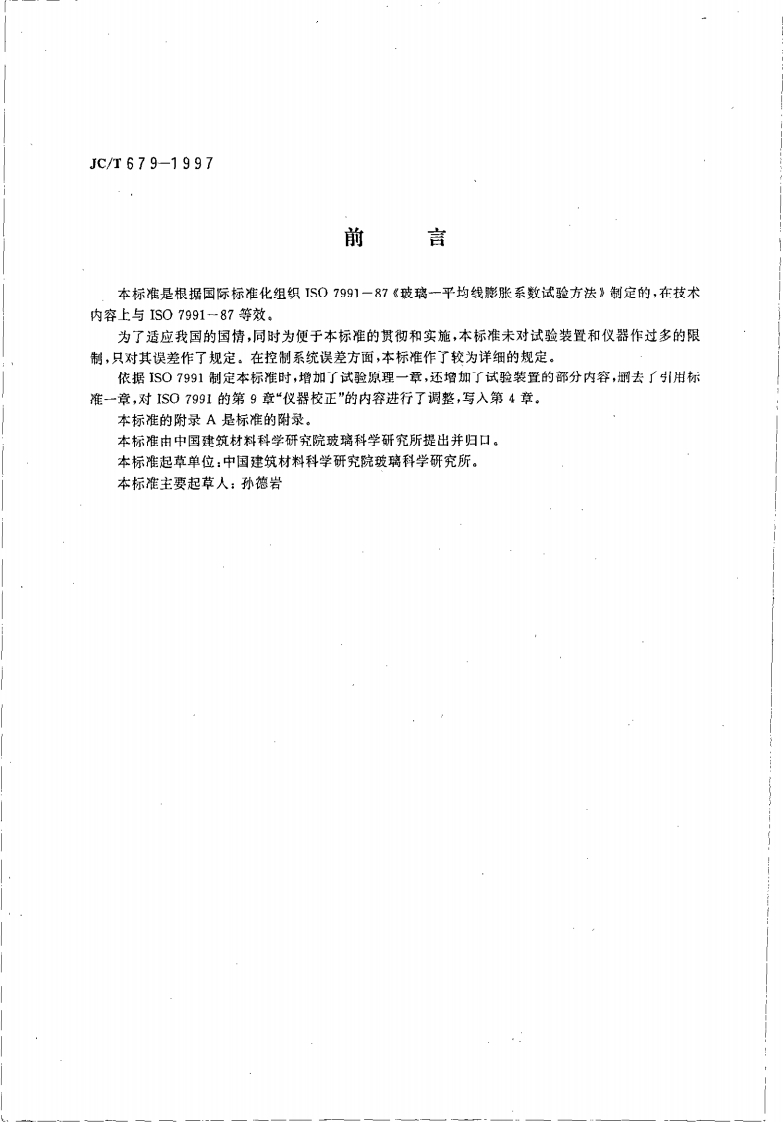 JCT679-1997玻璃平均线性热膨胀系数试验方法348072@abc4个月前发布关注私信0.27MB10页026JCT679-1997玻璃平均线性热膨胀系数试验方法此内容为付费资源,请付费后查看¥16¥23黄金会员免费钻石会员免费立即购买您当前未登录!建议登陆后购买,可保存购买订单付费资源 第1页 / 共10页 第2页 / 共10页 试读已结束,还剩8页,您可下载完整版后进行离线阅读 THE END标准规范 文本预览 D中华人民共和国建材行业标准Jc/T679-1997玻璃平均线性热膨胀系数试验方法Glass-The method for measuring coefficient ofmean linear thermal expansion1997-08-22发布1998-01-01实施国家建筑材料工业局发布 查看更多 收起部分 喜欢就支持一下吧收藏