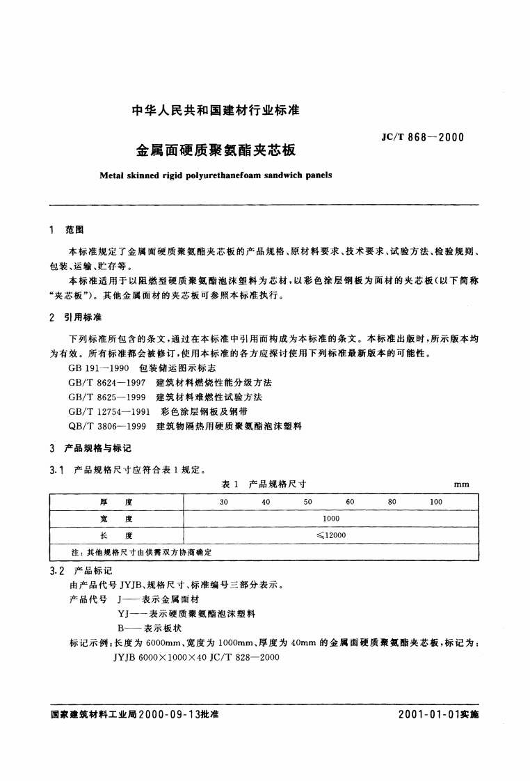 JC/T868-2000前言本标准是在总结金属面硬质聚氨酯泡沫塑料夹芯板10多年来生产、使用实践经验,吸取科学研究成果的基础上制定的。无同类产品的国外标准可参考。金属面硬质聚氨酯泡沫塑料夹芯板主要用于工业与民用建筑的屋面及内外墙体,所以标准规定的技术要求应满足上述使用的需要,试验方法尽可能与现行的建筑构件质量评定标准相一致。本标准由全国绝热材料标准化技术委员会提出并归口。本标准由中国绝热隔音材料协会、冶金部建筑研究总院负责起草。本标准参加起草单位:深圳赤晓组合房屋有限公司、浙江东南网架集团杭州东南新颗建筑板材有限公司、天津万力园实业有限公司、北京市北泡轻钢建材有限公司(北京市轻联集团新型建材冷藏设备分厂)、北方赤晓组合房屋有限公司、北京华都宝拉建筑板材有限公司、牡丹江三新建筑材料有限公司、辽宁盼盼新型建筑材料有限公司、浙江精工钢结构有限公司。本标准主要起草人:谢如荣、胡小媛、张德信、赵焕林、杨洪祺、赵伟川、陈同顺、王东、戴氢成、洪长禧、张庆伟。