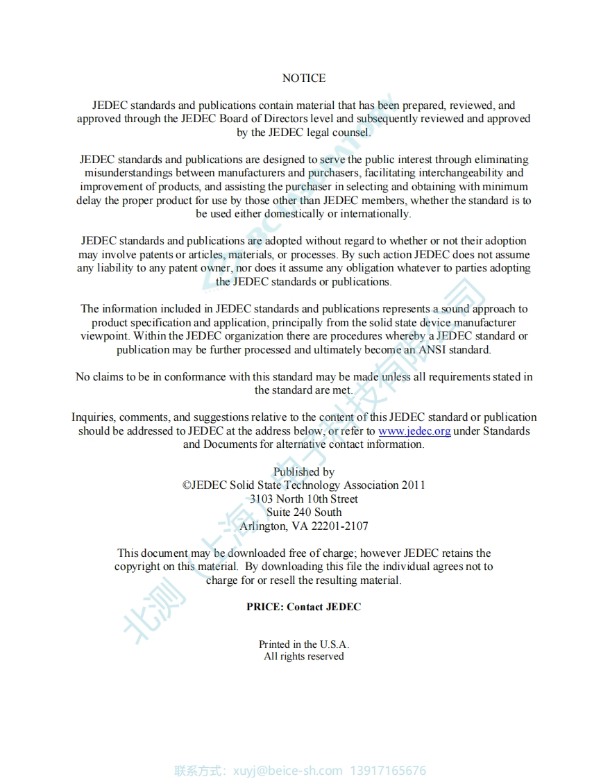 JEDECLABORATORYSTANDARDPower and Temperature CyclingJESD22-A105C(Revision of JESD22-A105-B)电子科有限公JANUARY 2004,Reaffirmed January 2011JEDEC SOLID STATE TECHNOLOGY ASSOCIATIONUE五EC联系方式:xuyj@beice-sh.com13917165676
