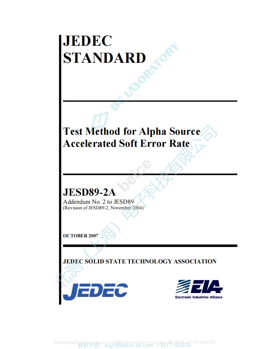 JEDECLABORATORYSTANDARDTest Method for Alpha SourceSoft Error RateJESD89-2AAddendum No.2 to JESD89(Revision of JESD89-2,November 2004)OCTOBER 2007JEDEC SOLID STATE TECHNOLOGY ASSOCIATIONJE五ECEIAElectronic Industries AlllanceDownloade联系为武!X@b8e28nR3971667647 am PDT