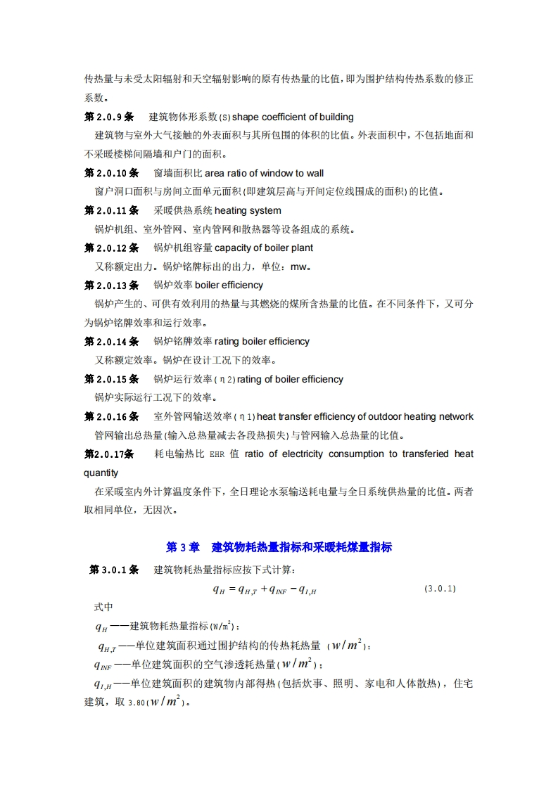 民用建筑节能设计标准JGJ26-95第1章总则第1.0,1条为了贯彻国家节约能源的政策,扭转我国严寒和寒冷地区居住建筑采暖能耗大、热环境质量差的状况,通过在建筑设计和采暖设计中采用有效的技术措施,将采暖能耗控制在规定水平,制订本标准。第1.0.2条本标准适用于严寒和寒冷地区设置集中采暖的新建和扩建居住建筑建筑热工与采暖节能设计。暂无条件设置集中采暖的居住建筑,其围护结构宜按本标准执行。第1.0.3条按本标准进行居住建筑建筑热工与采暖节能设计时,尚应符合国家现行有关标准、规范的规定。第2章术语、符号第2.0.1条采暖期室外平均温度(t)outdoormean air temperature during heating period在采暖期起止日期内,室外逐日平均温度的平均值。第2.O,2条采暖期度日数(Da:)degree days of heating period室内基准温度18℃与采暖期室外平均温度之间的温差,乘以采暖期天数的数值,单位℃.d.第2.0.3条采暖能耗(Q)energy consumed for heating用于建筑物采暖所消耗的能量,本标准中的采暖能耗主要指建筑物耗热量和采暖耗煤量。第2.0.4条建筑物耗热量指标(pH)ingex of heat loss of building在采暖期室外平均温度条件下,为保持室内计算温度,单位建筑面积在单位时间内消耗的、需由室内采暖设备供给的热量,单位:w/m。第2.0.5条采暖耗煤量指标(qe)index of coal consumeption for heating在采暖期室外平均温度条件下,为保持室内计算温度,单位建筑面积在一个采暖期内消耗的标准煤量,单位:kg/m。第2.0.6条采暖设计热负荷指标(g)index of design load for heating o fbuilding在采暖室外计算温度条件下,为保持室内计算温度,单位建筑面积在单位时间内需由锅炉房或其他供热设施供给的热量,单位:w/血。第2.0.7条围护结构传热系数(K)over all heat transfer coefficient of building envelope围护结构两侧空气温差为1k,在单位时间内通过单位面积围护结构的传热量,单位:w/(m2.k).第2.0.8条围护结构传热系数的修正系数(e1)correction factor for over all heat transfer coefficient of building envelope不同地区、不同朝向的围护结构,因受太阳辐射和天空辐射的影响,使得其在两侧空气温差同样为1k情况下,在单位时间内通过单位面积围护结构的传热量要改变。这个改变后的
