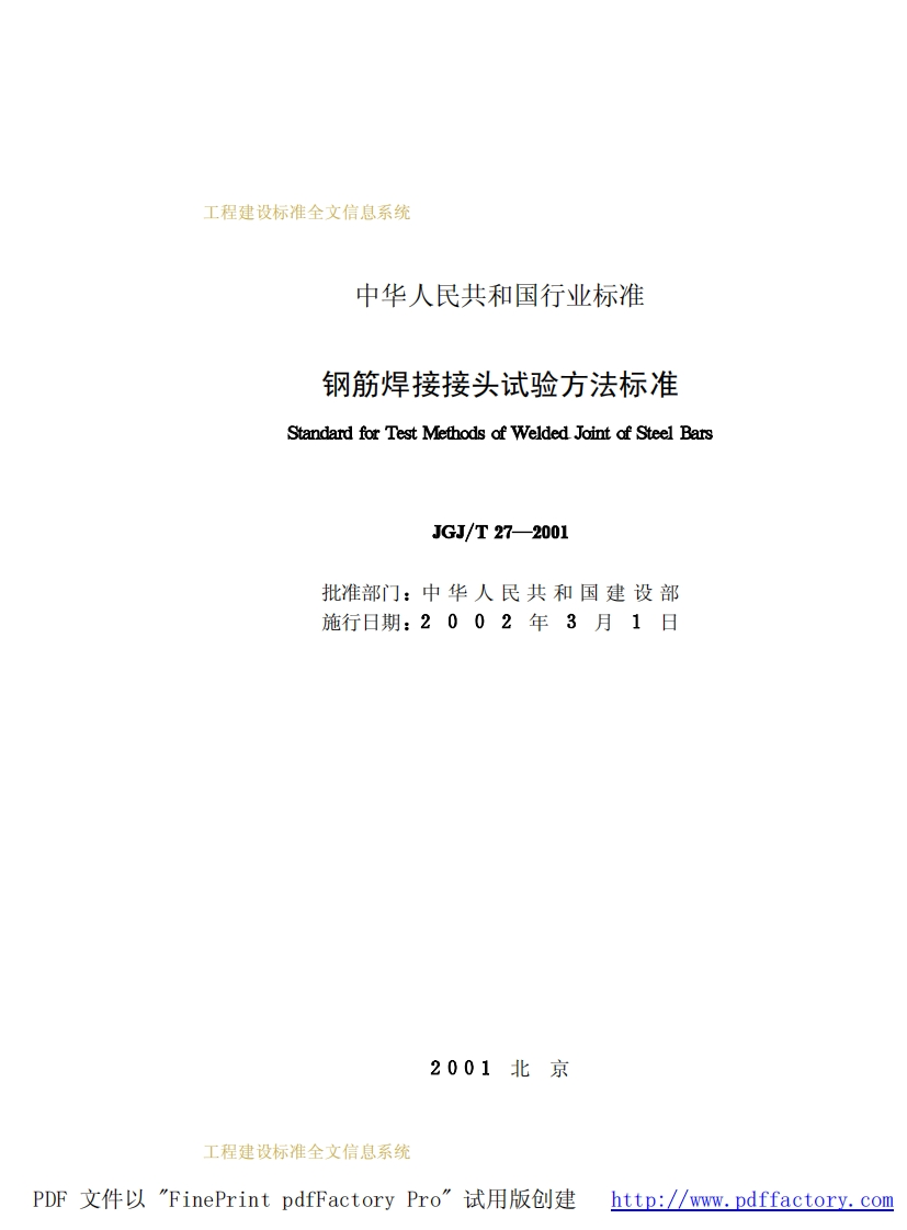 JGJ27T-2001钢筋焊接接头试验方法标准348072@abc4个月前发布关注私信0.47MB28页030JGJ27T-2001钢筋焊接接头试验方法标准此内容为付费资源,请付费后查看¥16¥23黄金会员免费钻石会员免费立即购买您当前未登录!建议登陆后购买,可保存购买订单付费资源 第1页 / 共28页 第2页 / 共28页 试读已结束,还剩26页,您可下载完整版后进行离线阅读 THE END标准规范 文本预览 工程建设标准全文信息系统中华人民共和国行业标准钢筋焊接接头试验方法标准Standard for Test Methods of WeldedJoint of Steel BarsJGJ/T27-2001J140—2001建标2001北京工程建设标准全文信息系统PDF文件以"FinePrint pdfFactory Pro”试用版创建http://www.pdffactory.com 查看更多 收起部分 喜欢就支持一下吧收藏