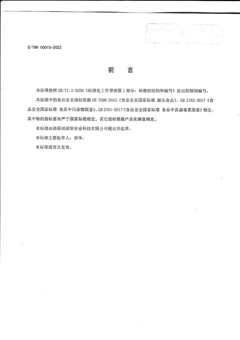 21040001S-2023真空软包装玉米罐头(清原田润华农业科技有限公司)348072@abc5个月前发布关注私信0.47MB6页03321040001S-2023真空软包装玉米罐头(清原田润华农业科技有限公司)此内容为付费资源,请付费后查看¥17¥22黄金会员免费钻石会员免费立即购买您当前未登录!建议登陆后购买,可保存购买订单付费资源 第1页 / 共6页 第2页 / 共6页 试读已结束,还剩4页,您可下载完整版后进行离线阅读 THE END标准规范 文本预览 任宁名苏狗企品实伞企业0S-2yQ/TRH清原田润华农业科技有限公司企业标准Q/TRH0001S-2022真空软包装玉米罐头2022-12-30发布2023-01-30实施清原田润华农业科技有限公司发布 查看更多 收起部分 喜欢就支持一下吧收藏