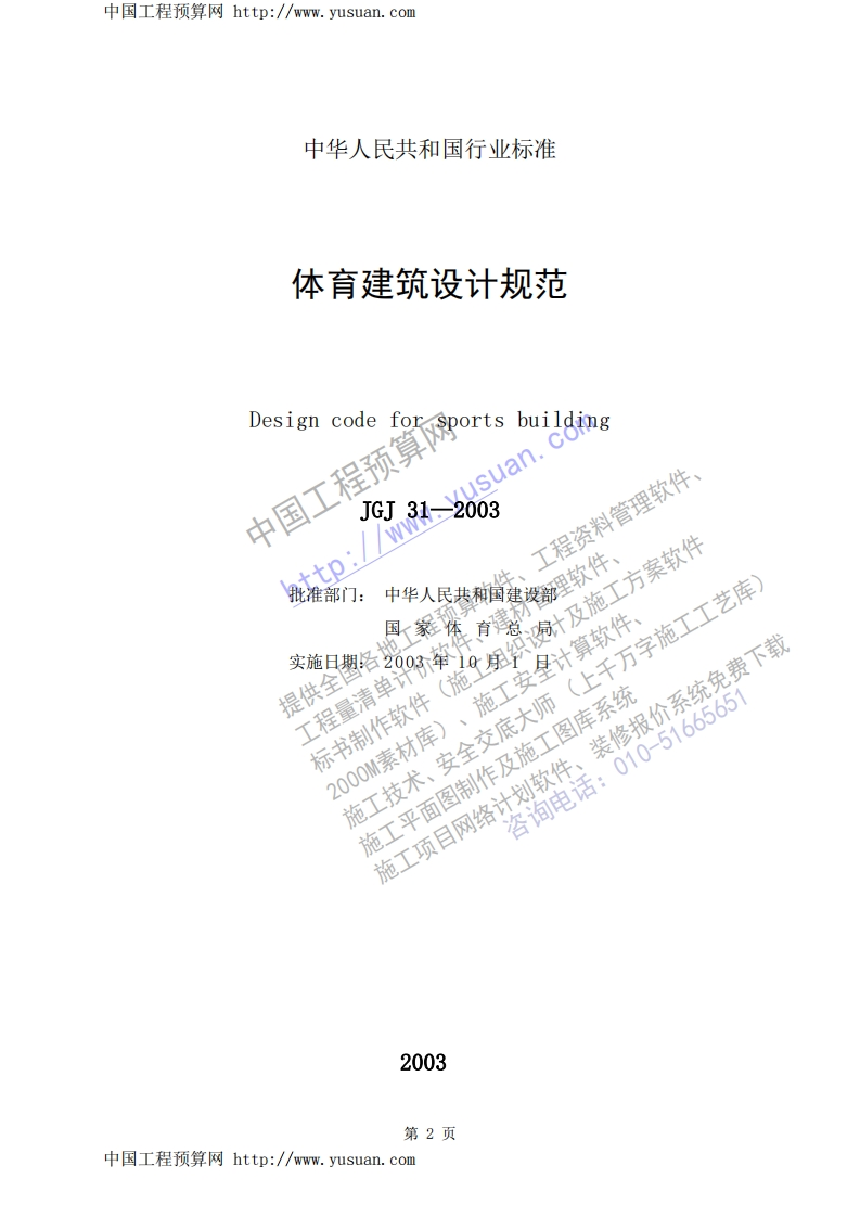 中国工程预算网http://www.yusuan.com中华人民共和国行业标准体育建筑设计规范中国工领蕨网:Chww.yus〔265-20g件、工程资料管理软件7标书制作软件(施工组织设计及施工方案软件工程量清单计价软件、建材管理软件、施工技术、安全交底大师(上千万字施工工艺库)提供全国各地工程预算2000M素材库)、施工安全计算软件、施工项目网络计划软件、装修报价系统免费下载施工平面图制作及施工图库系统咨询电话:010-516656512003第1页中国工程预算网http://www.yusuan.com