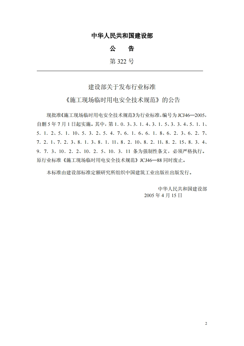 JGJ46-2005施工现场临时用电安全技术规范348072@abc4个月前发布关注私信1.57MB78页047JGJ46-2005施工现场临时用电安全技术规范此内容为付费资源,请付费后查看¥16¥23黄金会员免费钻石会员免费立即购买您当前未登录!建议登陆后购买,可保存购买订单付费资源 第1页 / 共78页 第2页 / 共78页 试读已结束,还剩76页,您可下载完整版后进行离线阅读 THE END标准规范 文本预览 中华人民共和国行业标准施工现场临时用电安全技术规范Technical code for safety of temporary electrificationon construction siteJGJ46--2005批准部门:中华人民共和国建设部施行日期:2005年7月1日 查看更多 收起部分 喜欢就支持一下吧收藏