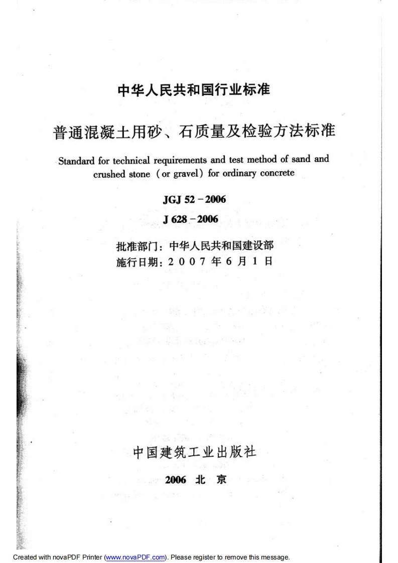 UDC中华人民共和国行业标准JPJGJ52-2006普通混凝土用砂、石质量及检验方法标准Standard for technical requirements and test methodof sand and crushed stone (or gravel)for ordinary concrete2006-12-19发布2007-06-01实施中华人民共和国建设部发布Created with novaPDF Printer(www.novaPDF.com).Please register to remove this message.