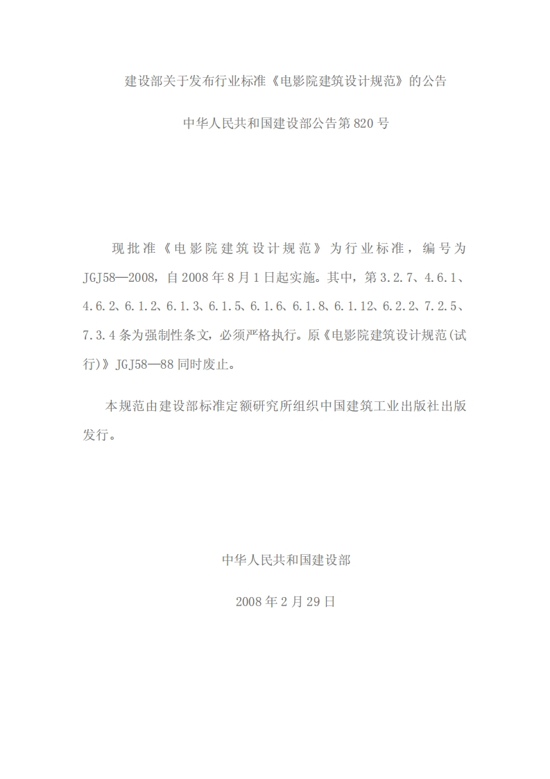 JGJ58-2008电影院建筑设计规范348072@abc4个月前发布关注私信0.55MB79页049JGJ58-2008电影院建筑设计规范此内容为付费资源,请付费后查看¥16¥23黄金会员免费钻石会员免费立即购买您当前未登录!建议登陆后购买,可保存购买订单付费资源 第1页 / 共79页 第2页 / 共79页 试读已结束,还剩77页,您可下载完整版后进行离线阅读 THE END标准规范 文本预览 中华人民共和国行业标准电影院建筑设计规范Code for architectural design of cinemaJGJ58-2008J785-2008批准部门:中华人民共和国建设部施行日期:2008年8月1日 查看更多 收起部分 喜欢就支持一下吧收藏