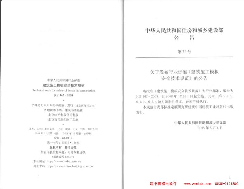 UDC中华人民共和国行业标准JGJ中华人民共和国行业标准JGJ162-2008建筑施工模板安全技术规范Technical code for safety of forms in construction建筑施工模板安全技术规范JGJ162-2008Technical code for safety of forms in constructionJ814-2008批准部门:中华人民共和国住房和城乡建设部施行日期:2008年12月1日建书软件生成完整脚手架、模板、施工临电设计计算方案书www.zmnl ab.com0535-21218002008-08-06发布2008-12-01实施中国建筑工业出版社2008北京中华人民共和国住房和城乡建设部发布