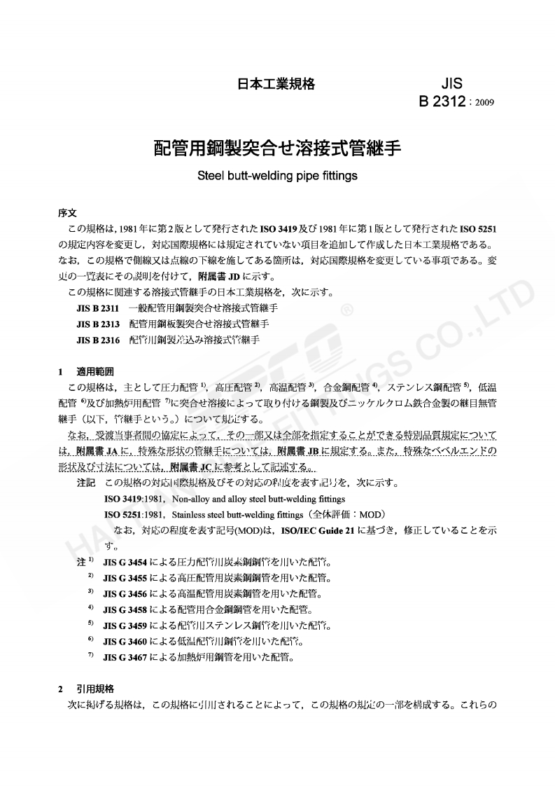 B2312:2009目次风一序文1適用範国2引用規格3用語及心定義…24種類……25耐任性………56化学成分7機械的性質…8才一又亏十亻卜平均桔晶粒度9硬这…10形状及乙寸法…611外観…12材料t…1713製造方法14横查…“2214.1耐狂梭查2214.2化学成分梭查…2314.3機械的性質横查……2314.4才一又テ十亻卜平均結晶粒度横查……2314.5硬达横查……2314.6形状及心寸法梭查…14.7外觀梭查……2315製品0呼乙U方…2316表示……2417報告…24附属書JA(規定)特别品質規定…41…25附属害JB(規定)特殊春形状刃管继手……28附属害JC(参考)特殊在八入儿工)ドD形状及U寸法:34附属害JD(参考)JS上对依寸石国際規格上)对比表………36(1)