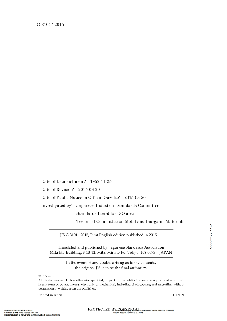 JISJAPANESEINDUSTRIALSTANDARDTranslated and Published byJapanese Standards AssociationJIS G 3101:2015(JISF)Rolled steels for general structureICS77.140.01;77.140.10Reference number JIS G 3101:2015 (E)PROTECTED RX COPYRIGHTy and ddon311S