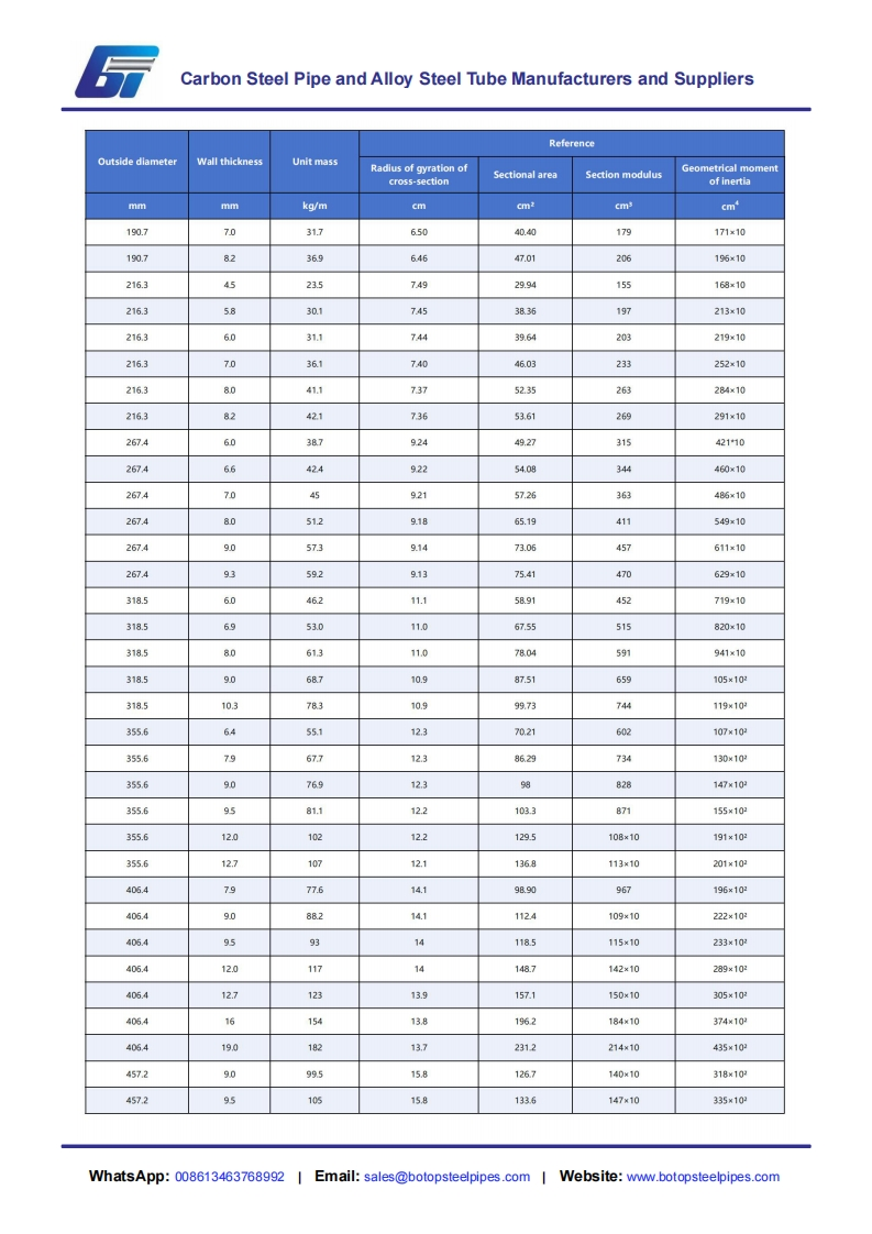 Carbon Steel Pipe and Alloy Steel Tube Manufacturers and SuppliersReferenceOutside diameterWall thicknessUnit massRadius of gyration ofcross-sectionSectional areaSection modulusGeometrical momentof inertiammmmkg/mcmcm2cmscm21.7200.9720.7001.2380.5600.607272201240.8901.5830.930126272231410.8301.7991.03141340231801.122.2911.70289427232291432.919280597427252.481423.1573.00640486232631643.3453.7089486252841.633.6213.979.6548.6283.161.624.0294.36106486323581.614564486118605233.302D64.2055.9017860.5324.522D35.76078423.760.5405.572D07.100941285763285.0B2606.46511.543.7763325.772597.34912.9492763405.572587.10015.659589.1285963057.59115.970.789.1326.783048.63617.9798101.6327.763489.89223.6120101.6409.6334512.2628.8146101.65011.934215.17349177114.3328.7739311.1730.2172114.3359.5639212.1832.7187114.3451223B915.5241234139.8361214B215451.1357139.8401344B017.07563394139.84515.047919.13627438139.86019847425.2280.956165.24517.B5.6822.7288.9734165.26023656330.01115952165.27127756035.25134110x10190.74520765926.32120114×10190.75324265630.87139133×10190.76027365334.82156149x10WhatsApp:008613463768992|Email:sales@botopsteelpipes.com Website:www.botopsteelpipes.com