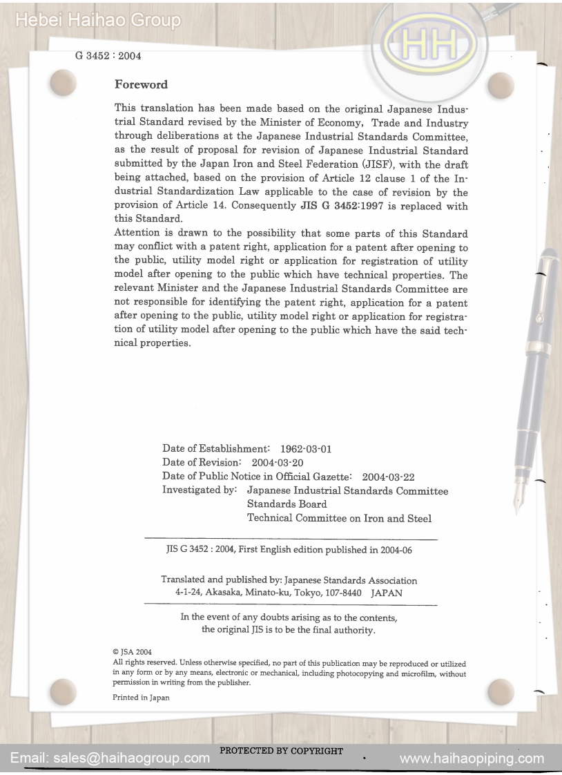 Hebei Haihao GroupJISJAPANESEINDUSTRIALSTANDARDTranslated and Published byJapanese Standards Association)JISG3452:204(JISF)Carbon steel pipes for ordinarypiping2si化8a.U+4月128ICS23.040.1077.140.75Reference number JIS G 3452 2004 (E)PROTECTED BY COPYRIGHTEmail:sales@haihaogroup.comwww.haihaopiping.com