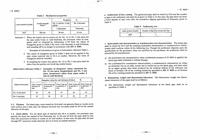 JI3G3452:1997Carbon steel pipes for ordinary pipingIntroduction This Standard comes to be conformed with "unifying perfarmance testmetbiod of the equipments for water supply service"established following the revision of"standard of the strocture and material of water supply facility hased on Water WorksLow".However,since steel plpes of this Standard are not suitable for water supply servieebased on the Water Works Law,water supply service is eliminated from the appllcable rangeby this revision.1 Scope This Japanese Industrial Standard specifies the carbon ateel pipes (hereafterreferred to as the "pipes")used for the pipings for conveying steam,water (excepting publicwater spply service),oil,gas,air,etc.at comparatively low working pressures.2 Nermative references Tbe standsrds shown in Attsched Table 1 contain provisiocswhich,through refereace in this Standard.constitute provisions of this Standard.The mostrecent editions of the standards indicated below shall be applied.3 Grade and designation The pipe shall be classified into one grade and its letter symbolshatl be as given in Table 1.and subdivided into black pipes and galvanized anes accordingto nonexistenee or existence of ginc-coated layers.Table 1 Letter symbol of gradeLemer symbol of cradeDivisionRemarksac立piePipe without zinc coatingSGPCalvasized pipeBlhc线pipe with zinc co四tir尾Remarks:Where it is necessary to identify the galvanized pipeby the letter symbol on the drawing and other docu-ments,"-ZN"shall be suffixed to the letter aymbolof the grade.This notation,however,shall not beapplied to the produet itself.4 Chemieal composition The pipe shall be subjected to the test of 11.1 and the resultingLadle analysis values shall be as given in Table 2.Table 2 Chemical compositionUnit:%Lemer symbol of geadeSOP0040ma%.0.040层e元s Mechanical properties5.1 Temstle strength and elongation The black pipe shall be subjected to the test of 11.3and the resulting tensile strengtb and eloogation shall be as given in Table 3.一153一