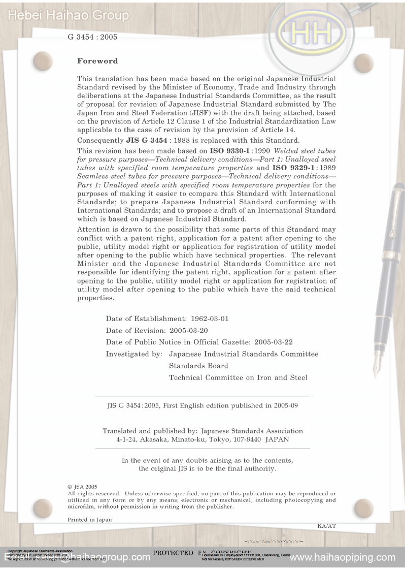 Hebei Haihao GroupJAPANESEINDUSTRIALSTANDARDTranslated and Published byJapanese Standards Association60JISG3454:205(JISF)Carbon steel pipes forpressure serviceICS23.040.10:77.140.75Reference number JIS G 3454:2005 (E)inghaihaogroup.comPROTECTEDwww.haihaopiping.com