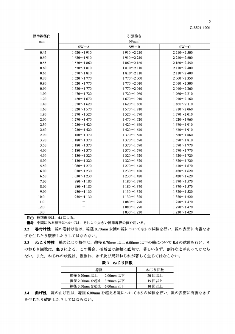 日本工業規格JIS(G)G3521-1991硬鋼線Hard drawn steel wires1.適用範困二D規格仕,硬霸線(以下,線上v八5。)仁∽℃規定寸石。備考1.二D規格)引用規格在,次仁示寸。J1SG3506硬鋼線材JISZ2241金属材料引跟武骏方法2.二D规格对心国際规格花,次仁示寸。ISO 8458-1:1989 Steel wire for mechanical springs (Part 1)ISO 8458-2:1989 Steel wire for mechanical springs (Part 2)2.程類,配号及心道用糠径線)種類体3種類上L,七D記号及適用腺径仕,:表1化上为。表1種類,配号及心適用,径種類記号適用線径摘要硬钢線A翘SW-A0.08mm以上10.0mm以下硬線B稀SW-B主上L℃静荷承硬鋼線C極0.08mm以上13.0mm以下SW-C在受付石试热用3.機械的性質3.1引張強老腺灶,82D武驗花行v八,名)引張強老杜表2化上石。囊2引張強吉標準橡径(引跟強这mmN/mm2SW-ASW-BSW-C0.0821102450245027902790~31400.0920602400240027502750~30900.102010235023502700270030400.1219602300230026502650~29900.141960~2260226026002600-29400.161910221022102550255028900.18191022102210-25002500-28400.201910221022102500250027900.231860216021602450245027500.261810~21102110~24002400-27000.29177020602060~2350235026500.321720~20102010-2300230026000.351720~2010201023002300-26000.401670~19601960~22602260一2550