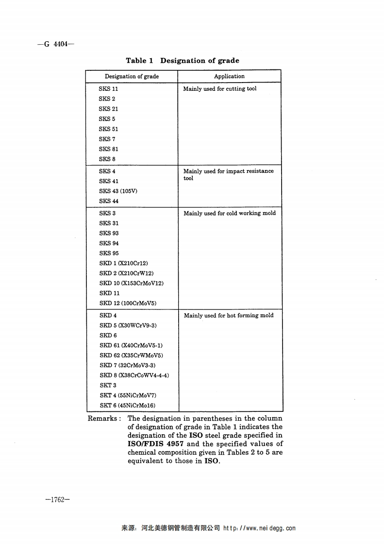 G)JΠSG4404:2000Alloy tool steelsIntroduction This Japanese Industrial Standard has been prepared based on thecorresponding International Standard,ISO/FDIS 4957:1998 Tool steels at the"Modified"level of ISO/IEC Guide 21:1999 on the occasion of reviewing JIS G 4404:1983 in accordance with JIS Z 8301 Rules for the drafting and presentation of JapaneseIndustrial Standards.1 Scope This Standard specifies the alloy tool steels (hereafter referred to as "steels")manufactured by hot-rolling or forging.Remarks:The International Standard corresponding to this Standard is as fol-lows.In addition,designation indicating the degree of correspondence isIDT (identical),MOD (modified),and NEQ(not equivalent)in accor-dance with ISO/IEC Guide 21.ISO/FDIS 4957 Tool steels (MOD)2 Normative references The standards given in Attached Table 1 contain pro-visions which,through reference in this Standard,constitute provisions of this Standard.The most recent editions of the standards(including amendments)shall apply.3 Grade and designation The steels shall be classified into 32 grades and thedesignation shall be as given in Table 1.来源:河北美德钢管制造有限公司http:IIww.mei degg..com-1761-