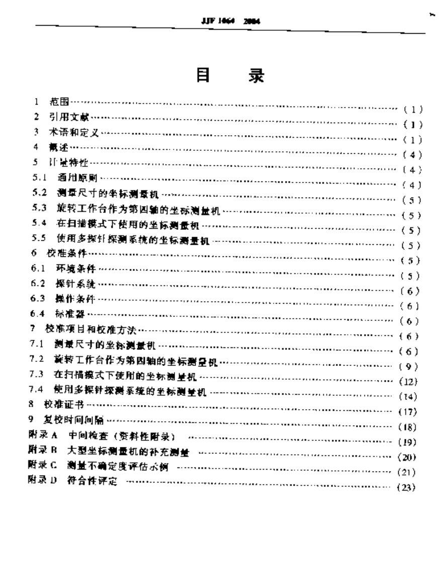 U亚14一2坐标测量机校准规范JJF064-204Calibration Specification for代替JF064一2000Coordinate Measuring Machinc本规范经国家质量监督检学趁接总局于204年06月04日批准、并自2004年12月01日起施行:归口单位:全国几何量长度计量技术委员会主要起草单位:中计量科学研究院参加起草单位:寺岛前哨测堂技术有限公可中国航空业第-集团公可北京航空精密机械研究听本规范由」口单位负责解吊