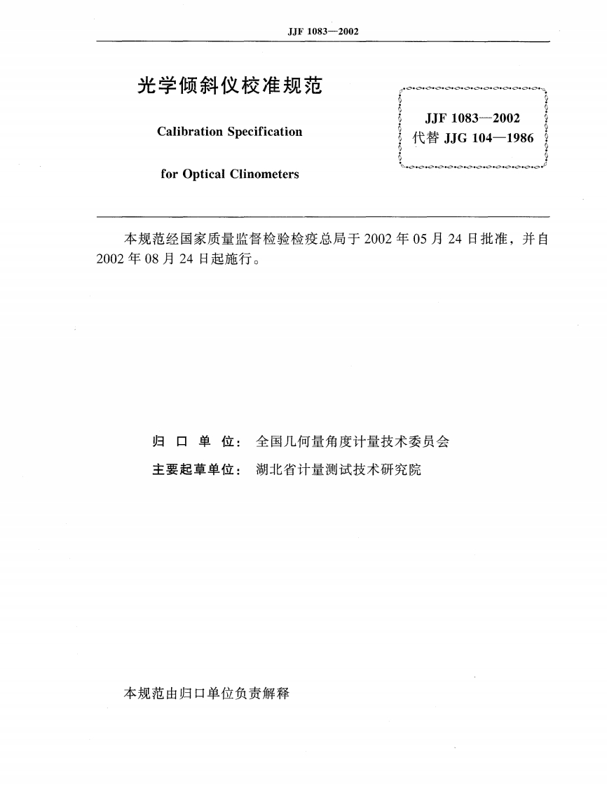 JJF1083-2002光学倾斜仪校准规范348072@abc4个月前发布关注私信0.75MB14页031JJF1083-2002光学倾斜仪校准规范此内容为付费资源,请付费后查看¥16¥23黄金会员免费钻石会员免费立即购买您当前未登录!建议登陆后购买,可保存购买订单付费资源 第1页 / 共14页 第2页 / 共14页 试读已结束,还剩12页,您可下载完整版后进行离线阅读 THE END标准规范 文本预览 中华人民共和国国家计量技术规范JJF1083一2002光学倾斜仪校准规范Calibration Specification for Optical Clinometers2002-05-24发布2002-08-24实施国家质量监督检验检疫总局发布 查看更多 收起部分 喜欢就支持一下吧收藏