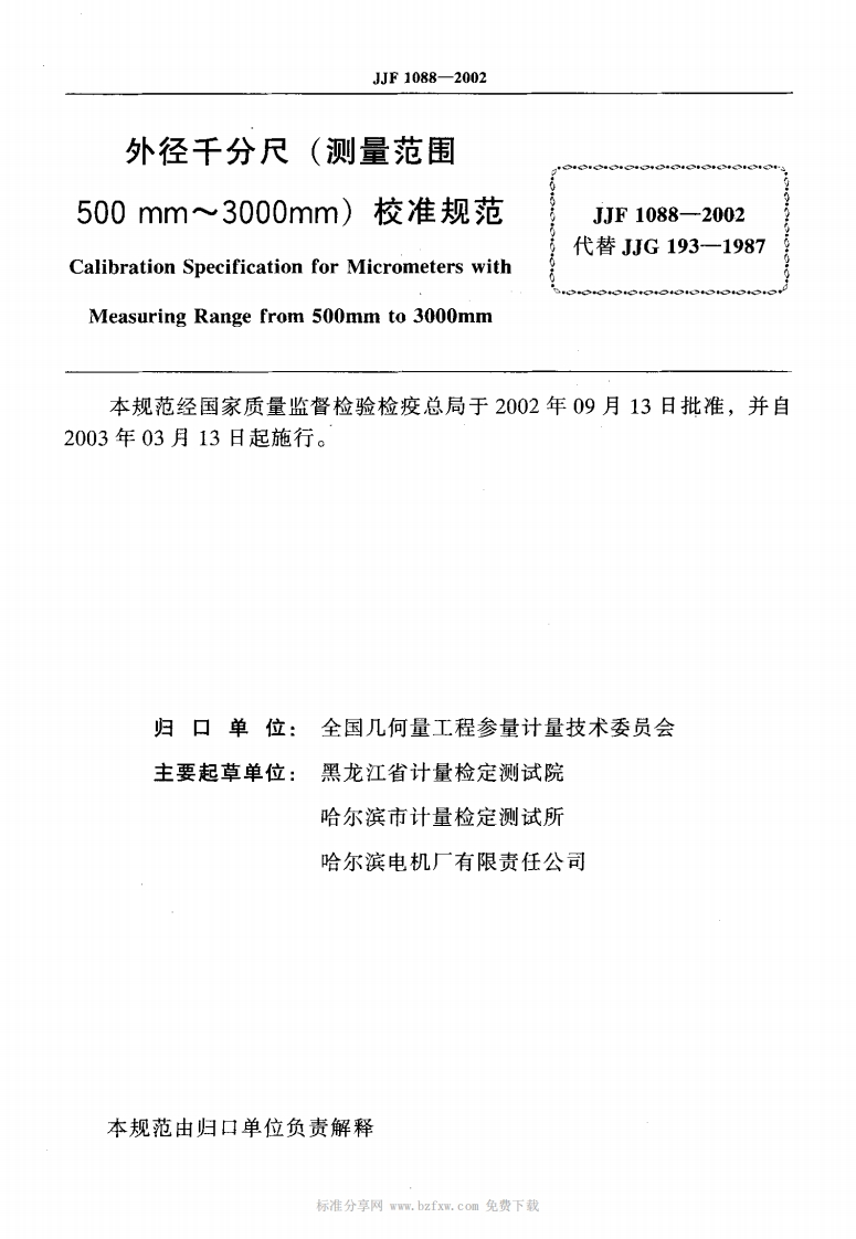 JJF1088-2002外径千分尺(测量范围500mm~3000mm)校准规范348072@abc4个月前发布关注私信0.46MB21页021JJF1088-2002外径千分尺(测量范围500mm~3000mm)校准规范此内容为付费资源,请付费后查看¥16¥23黄金会员免费钻石会员免费立即购买您当前未登录!建议登陆后购买,可保存购买订单付费资源 第1页 / 共21页 第2页 / 共21页 试读已结束,还剩19页,您可下载完整版后进行离线阅读 THE END标准规范 文本预览 可月中华人民共和国国家计量技术规范JJF1088-2002外径千分尺(测量范围500mm≈3000mm)校准规范Calibration Specification for Micrometers withMeasuring Range from 500mm to 3000mm2002-09-13发布2003一03-13实施国家质量监督检验检疫总局发布 查看更多 收起部分 喜欢就支持一下吧收藏
