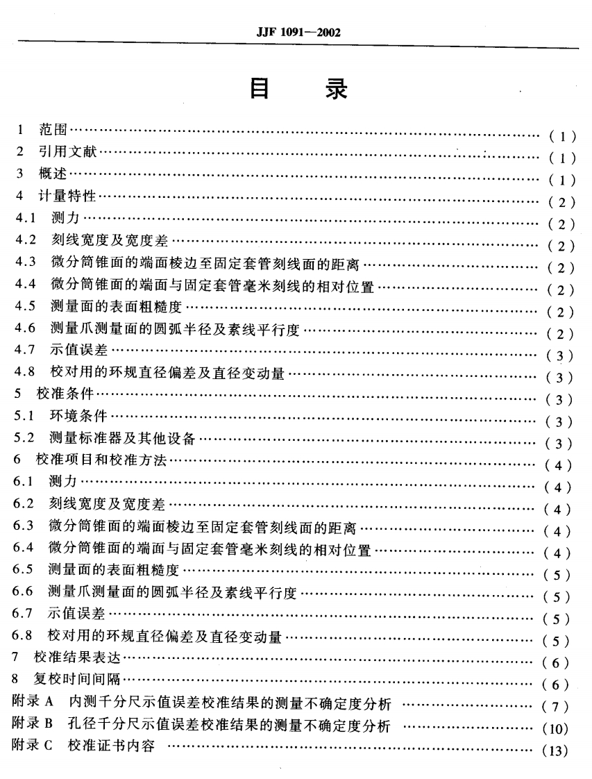 JJF1091-2002测量内尺寸千分尺校准规范JJF1091—2002Calibration Specification for代替JJG378一1985Micrometers for Measuring Inside DimensionJJG23-1988本规范经国家质量监督检验检疫总局于2002年11月04日批准,并自2003年05月04日起施行。归口单位:全国几何量工程参量计量技术委员会主要起草单位:黑龙江省计量检定测试院参加起草单位:青海量具刃具有限责任公司本规范由归口单位负责解释